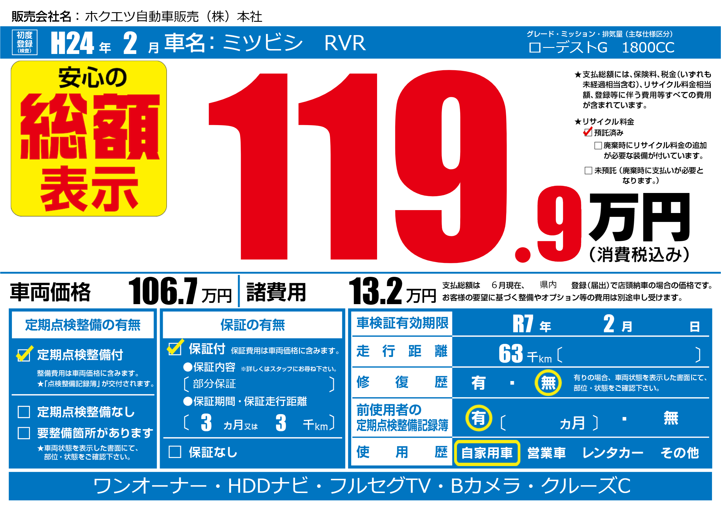 | 車名 | ミツビシ RVR | グレード ミッション 排気量 |