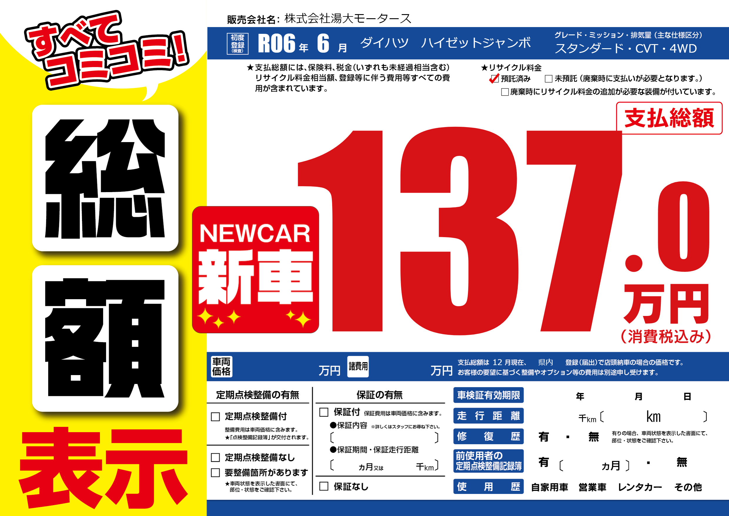 | 車名 | ダイハツ ハイゼットジャンボ | グレード ミッション 排気量 |
