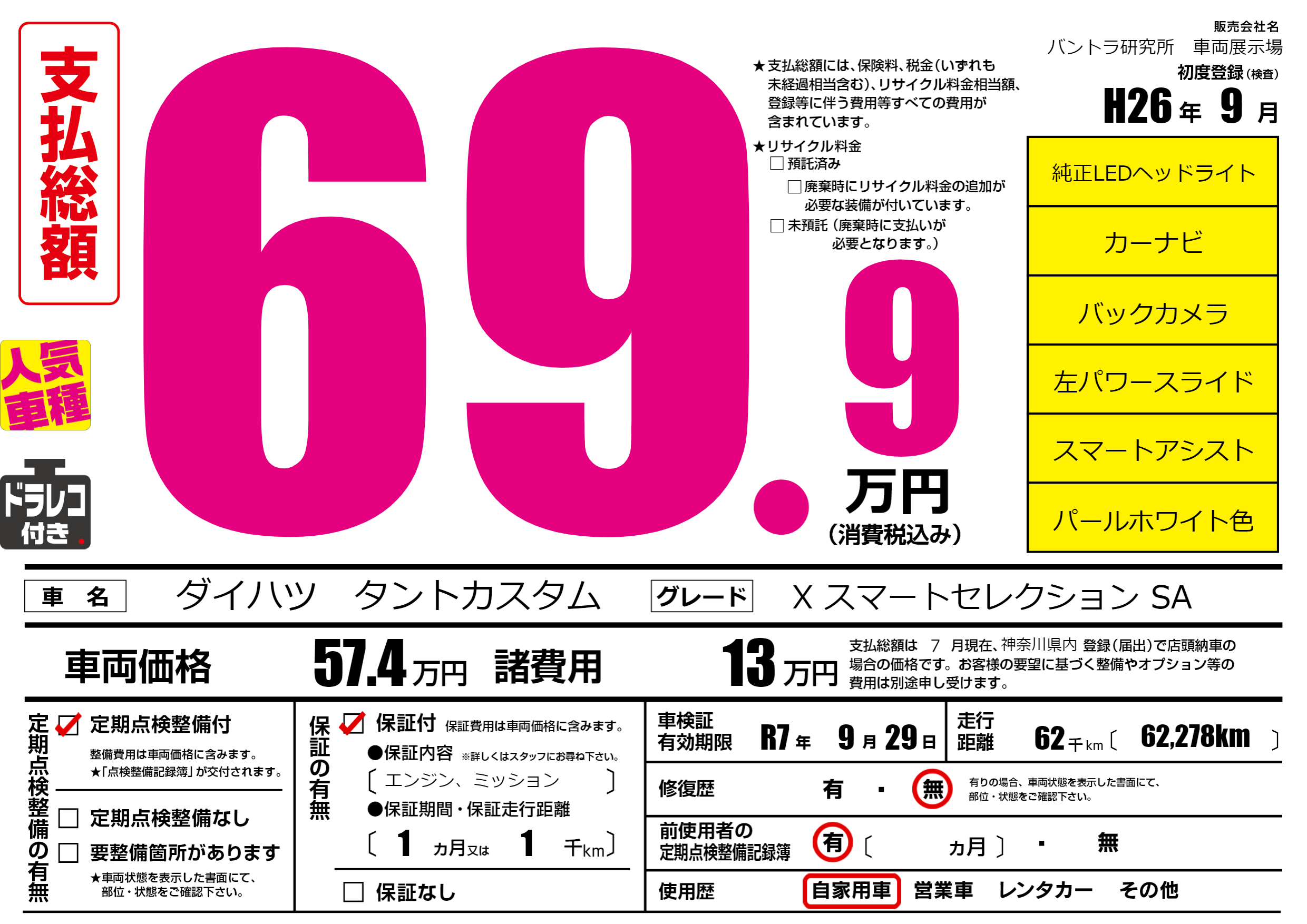 | 車検制限 | R7年 9月 29日 | ||
