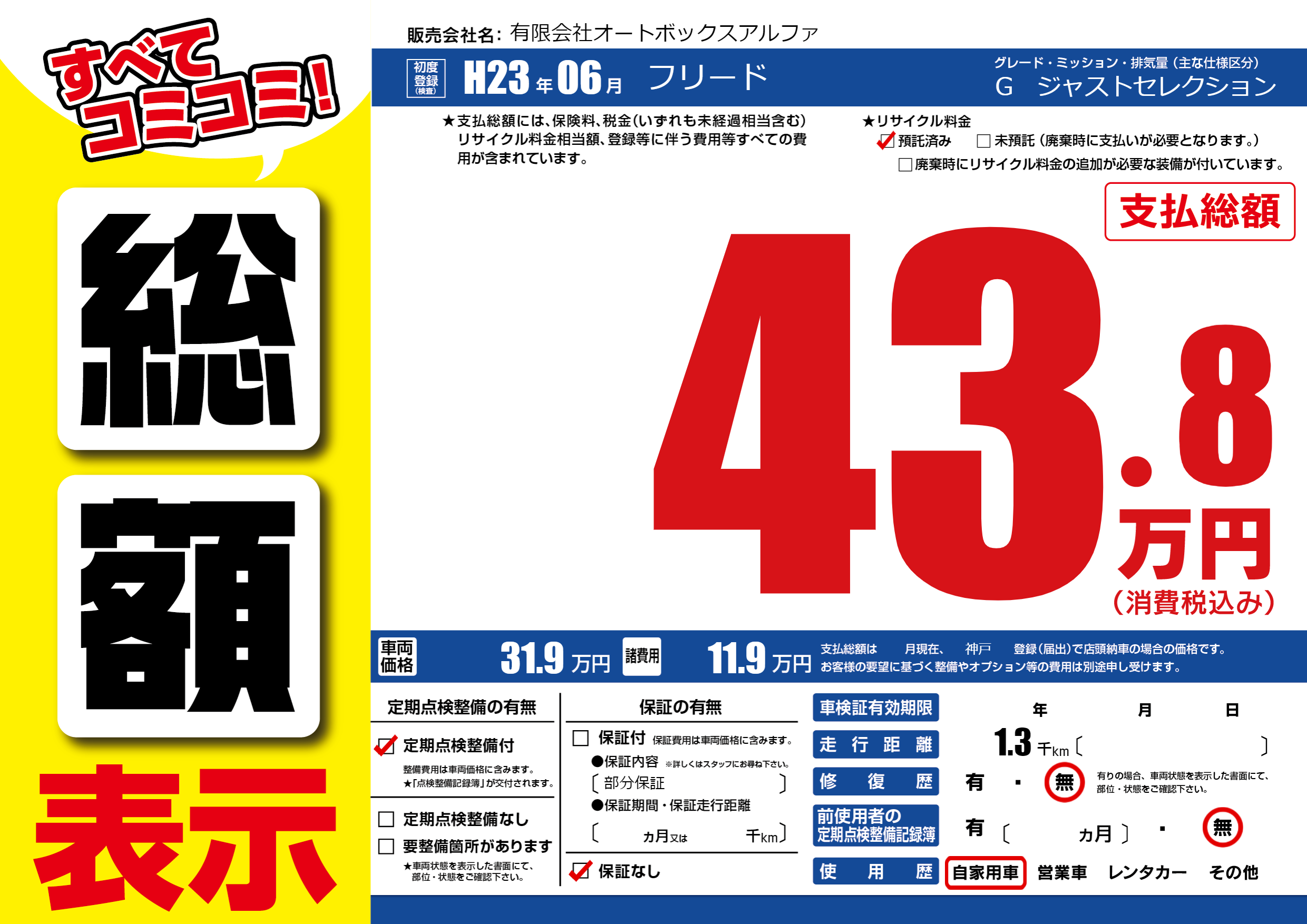 保証なし 保証内容(部分保証) ---ヶ月または()千kmまで |