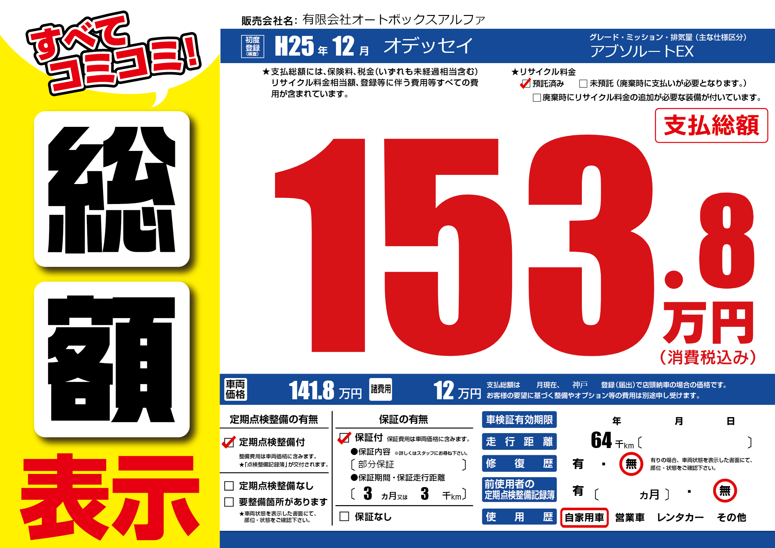 | 車名 | オデッセイ | グレード ミッション 排気量 |