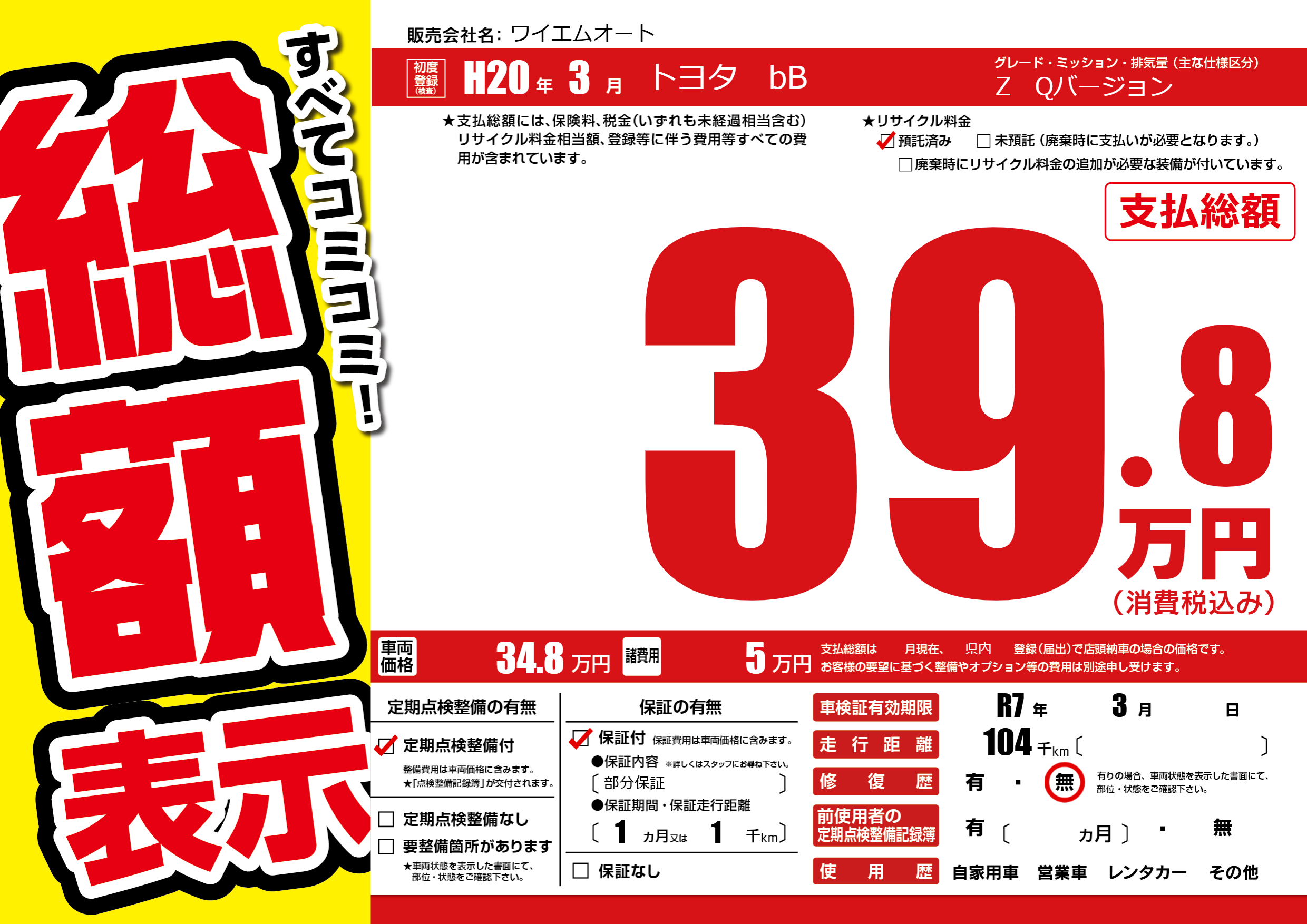 | 車名 | トヨタ bB | グレード ミッション 排気量 |