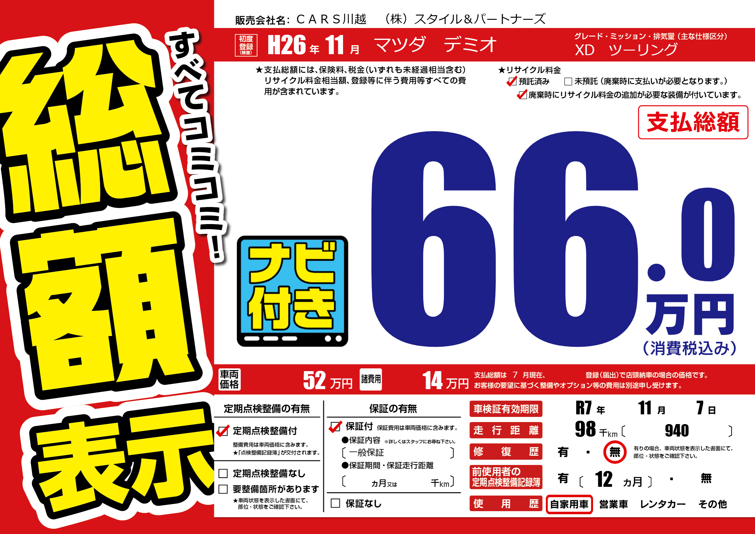 | 車名 | マツダ デミオ | グレード ミッション 排気量 |