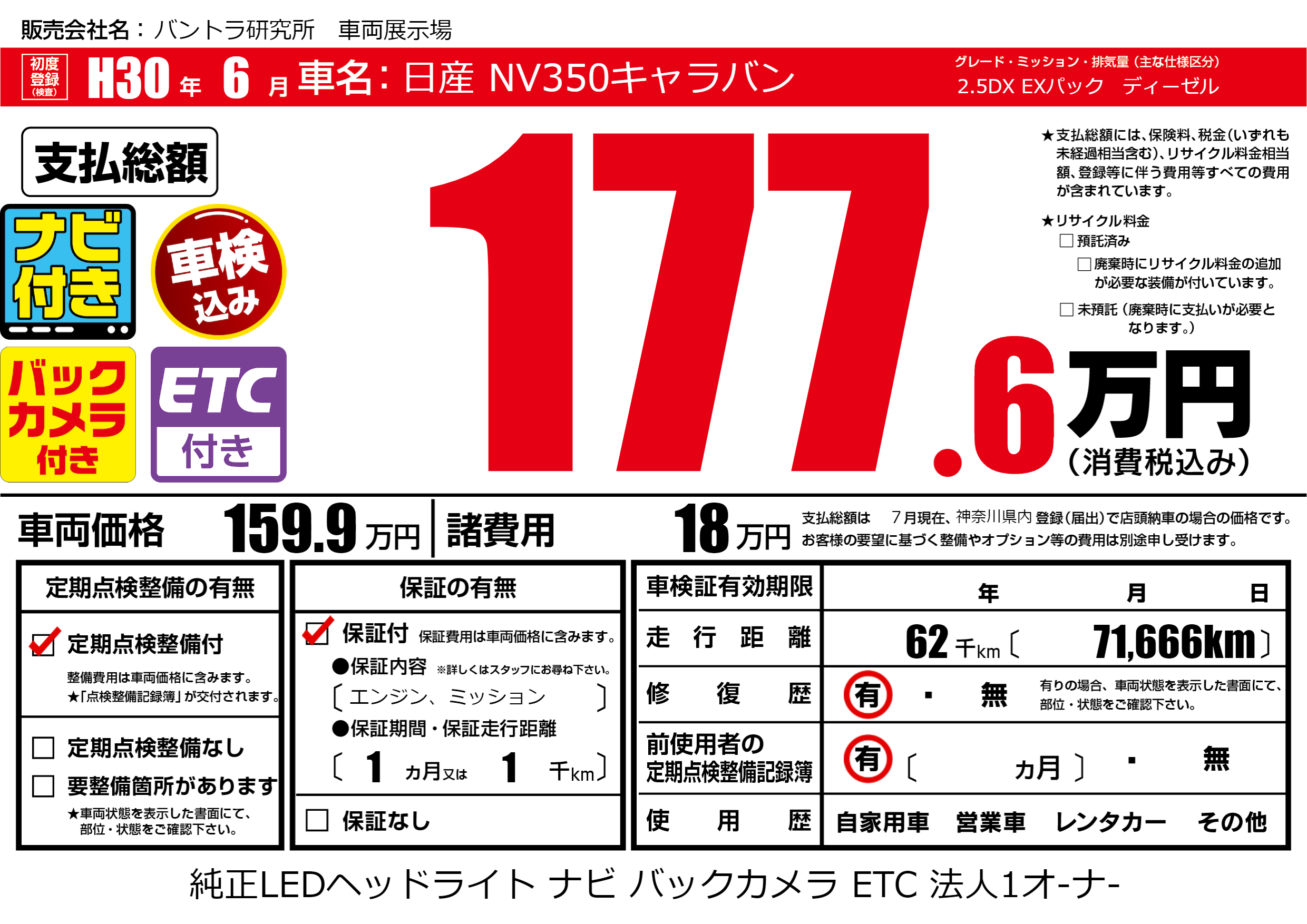 | 車名 | 日産 NV350キャラバン | グレード ミッション 排気量 |