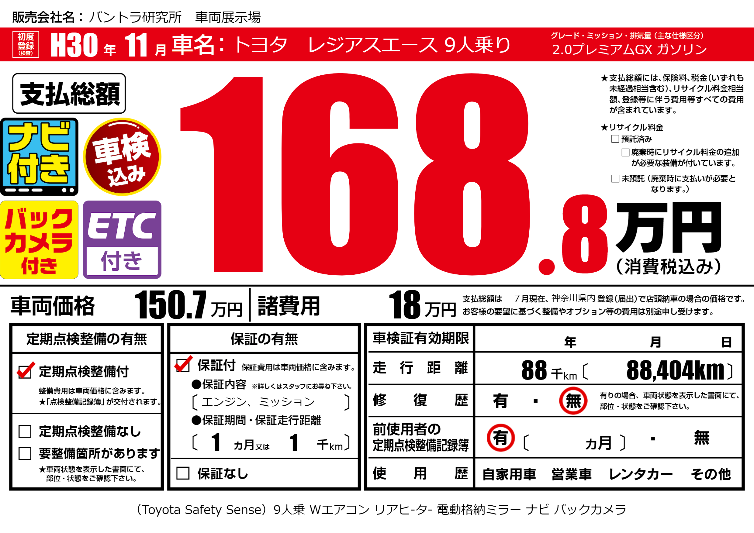 | 走行キロ | 8.8万km | 初年度登録 | H30年11月 |