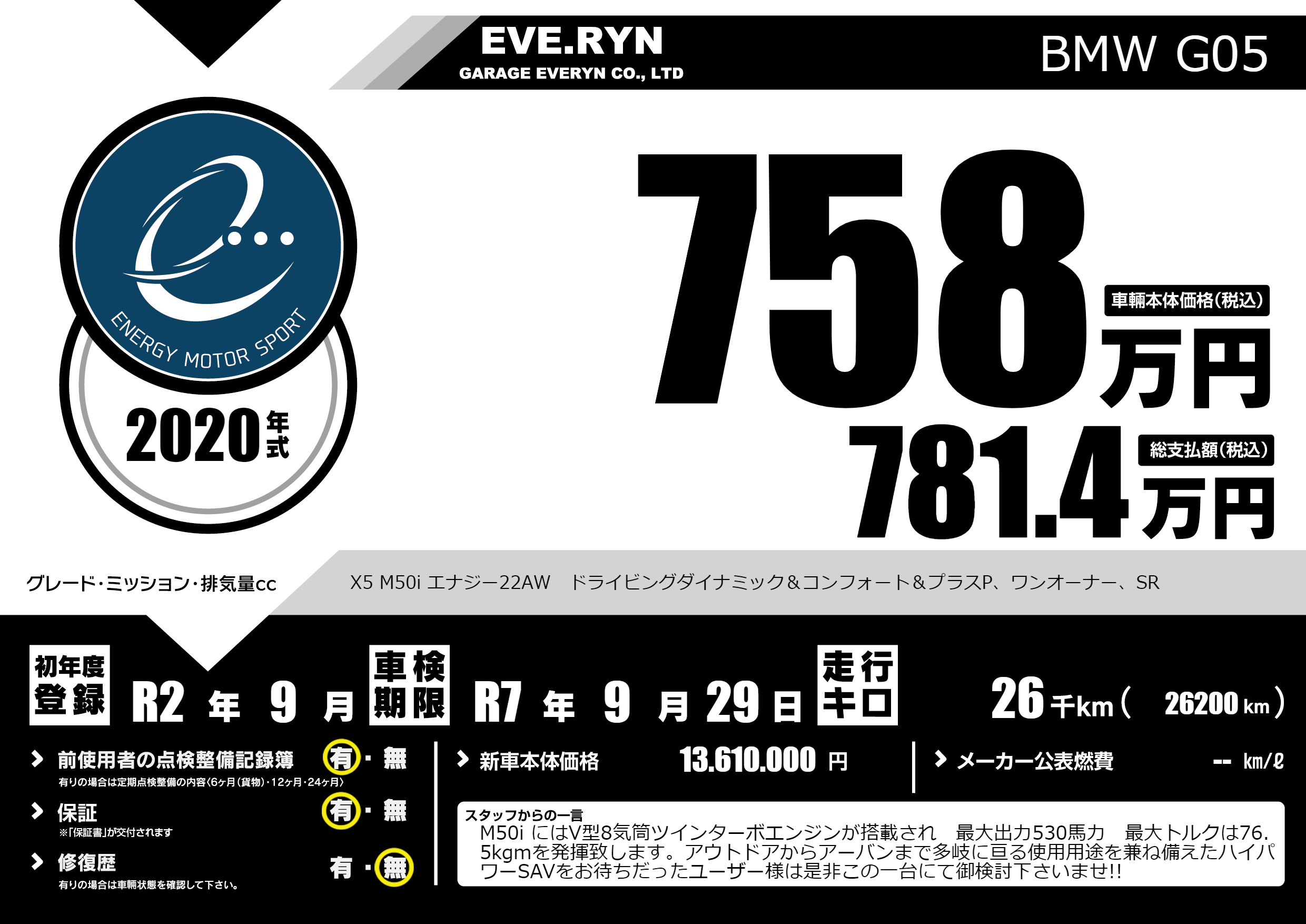 X5 M50i エナジー22AW ドライビングダイナミック&コンフォート&プラスP、ワンオーナー、SR |