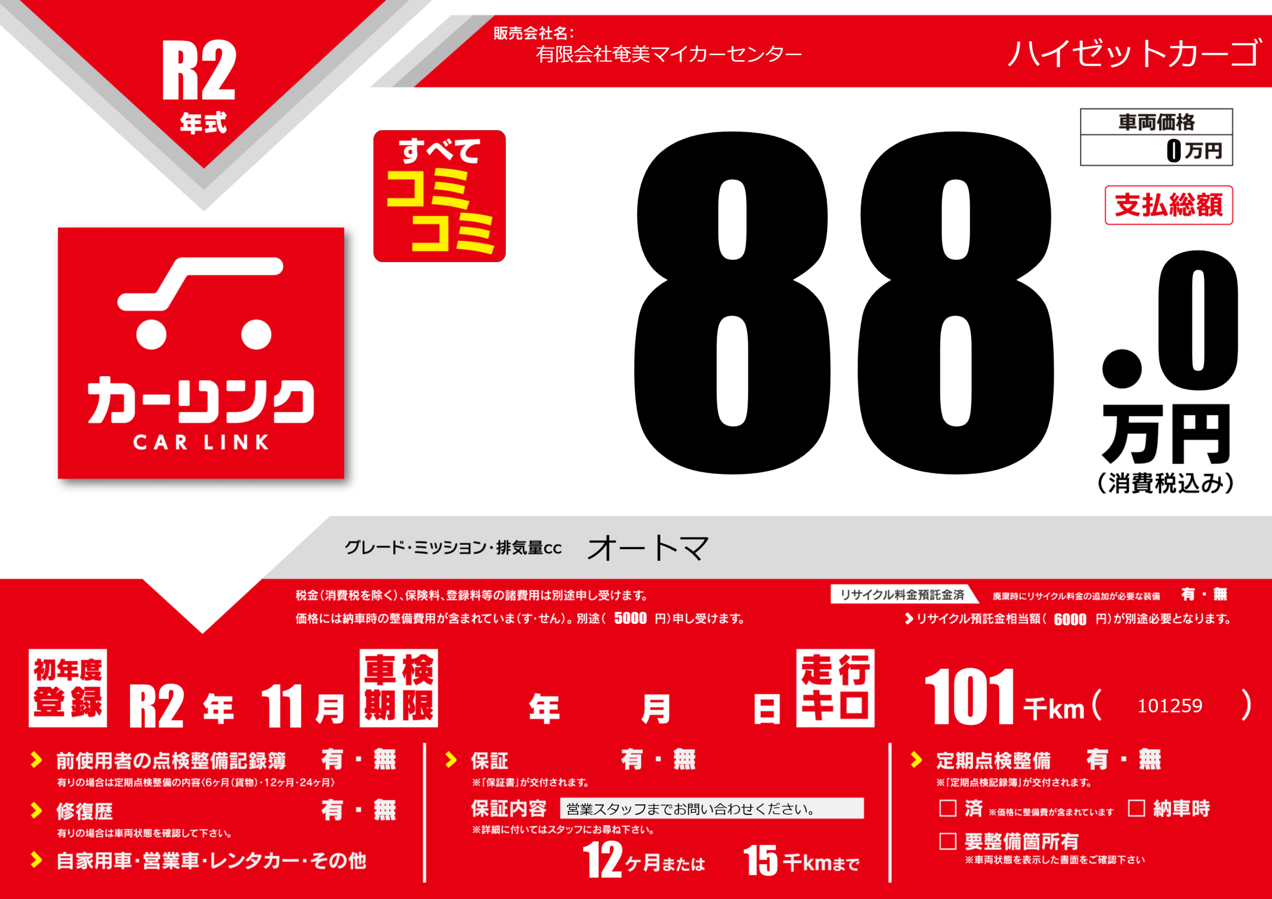 | 車名 | ハイゼットカーゴ | グレード ミッション 排気量 |