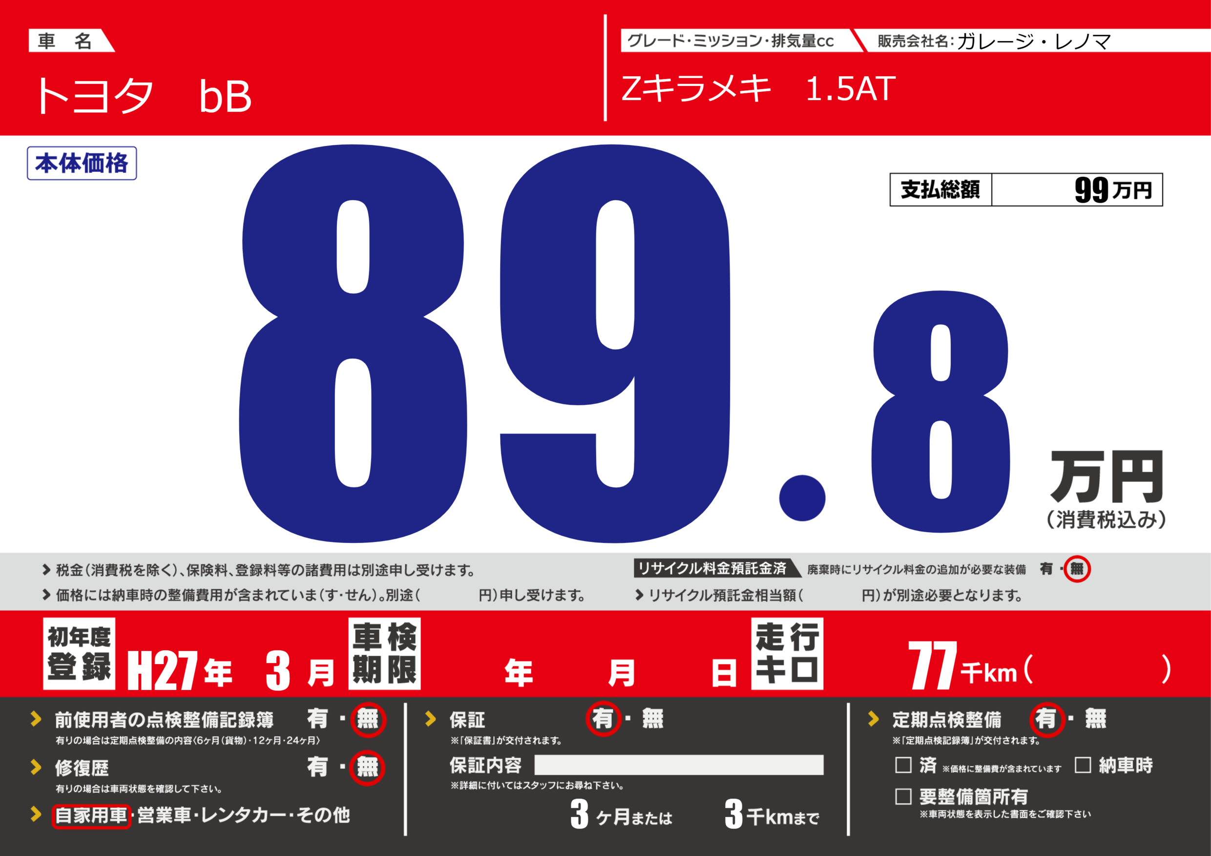 | 車名 | トヨタ bB | グレード ミッション 排気量 |