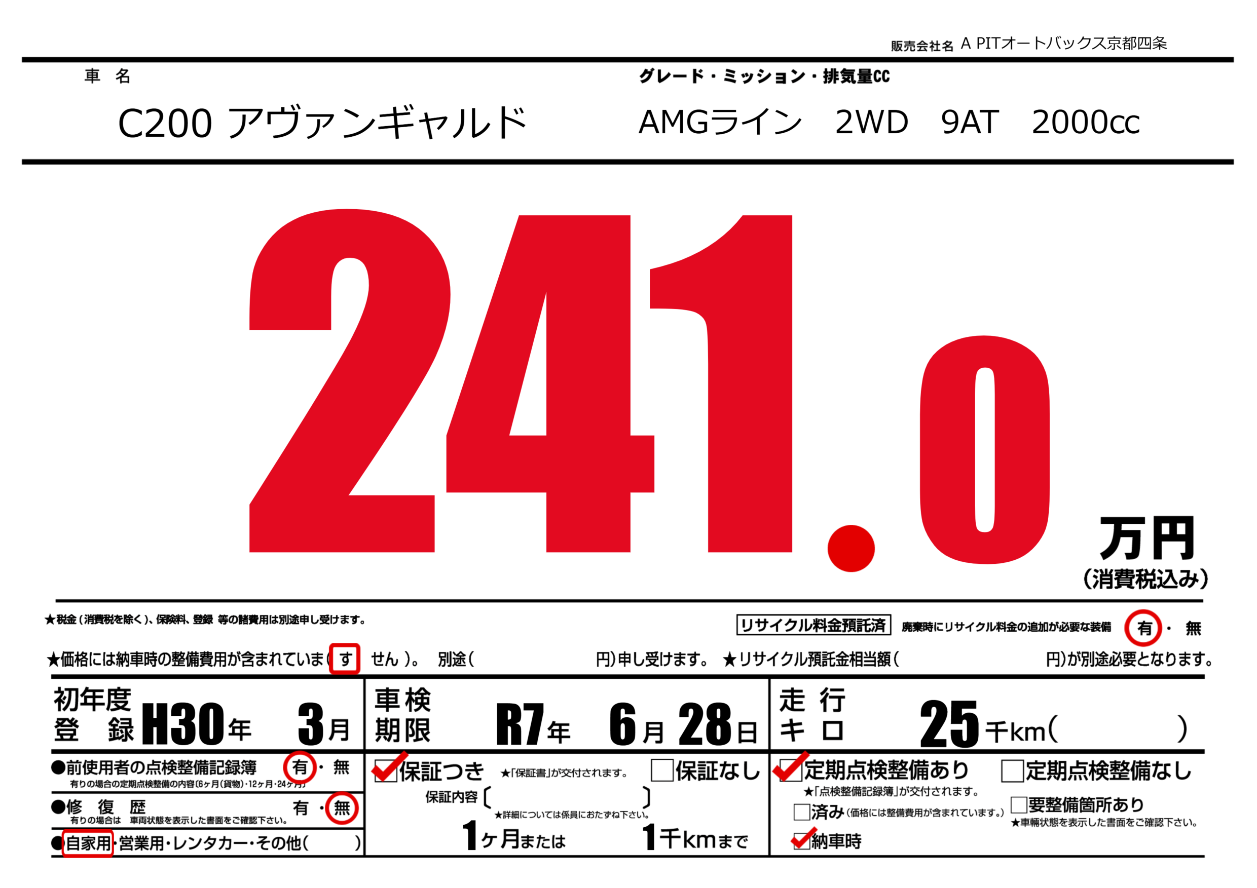 | 車名 | C200 アヴァンギャルド | グレード ミッション 排気量 |