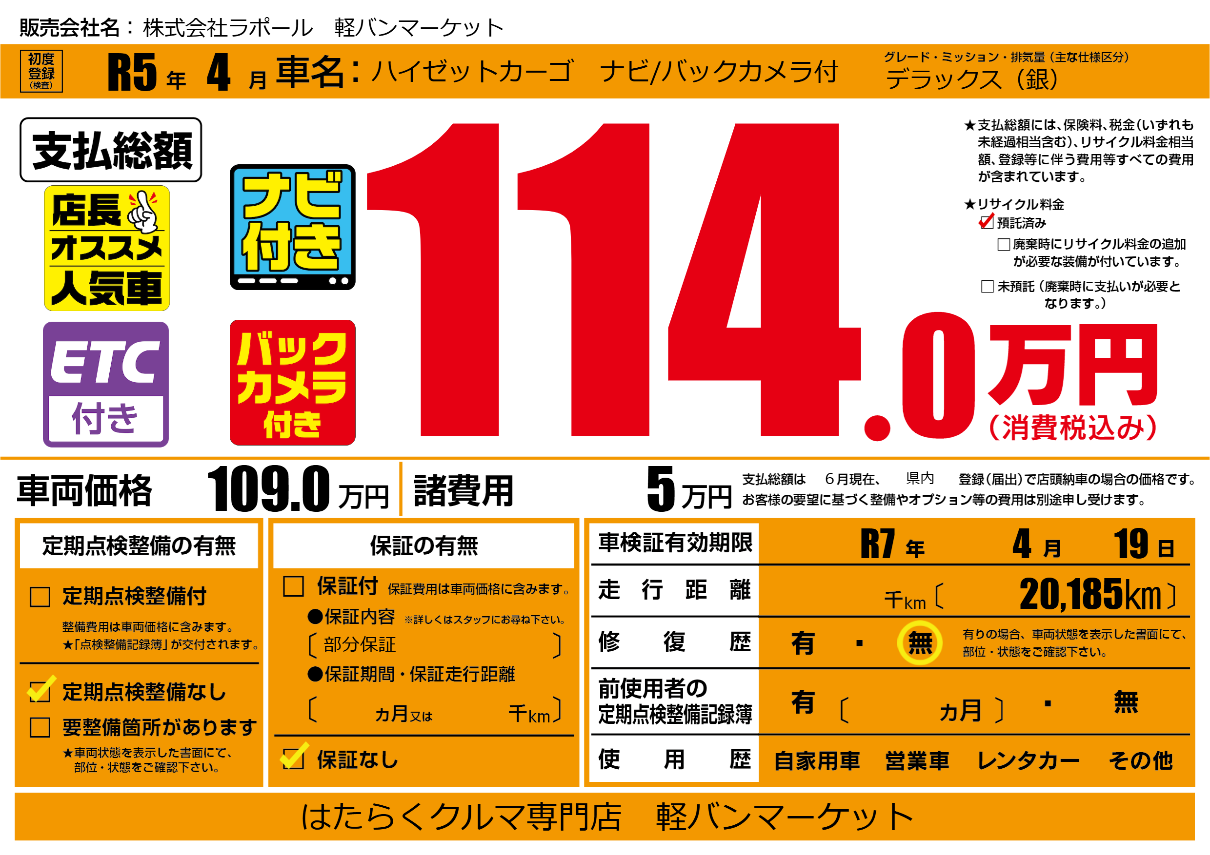 なし | 車検制限 | R7年4月19月 |