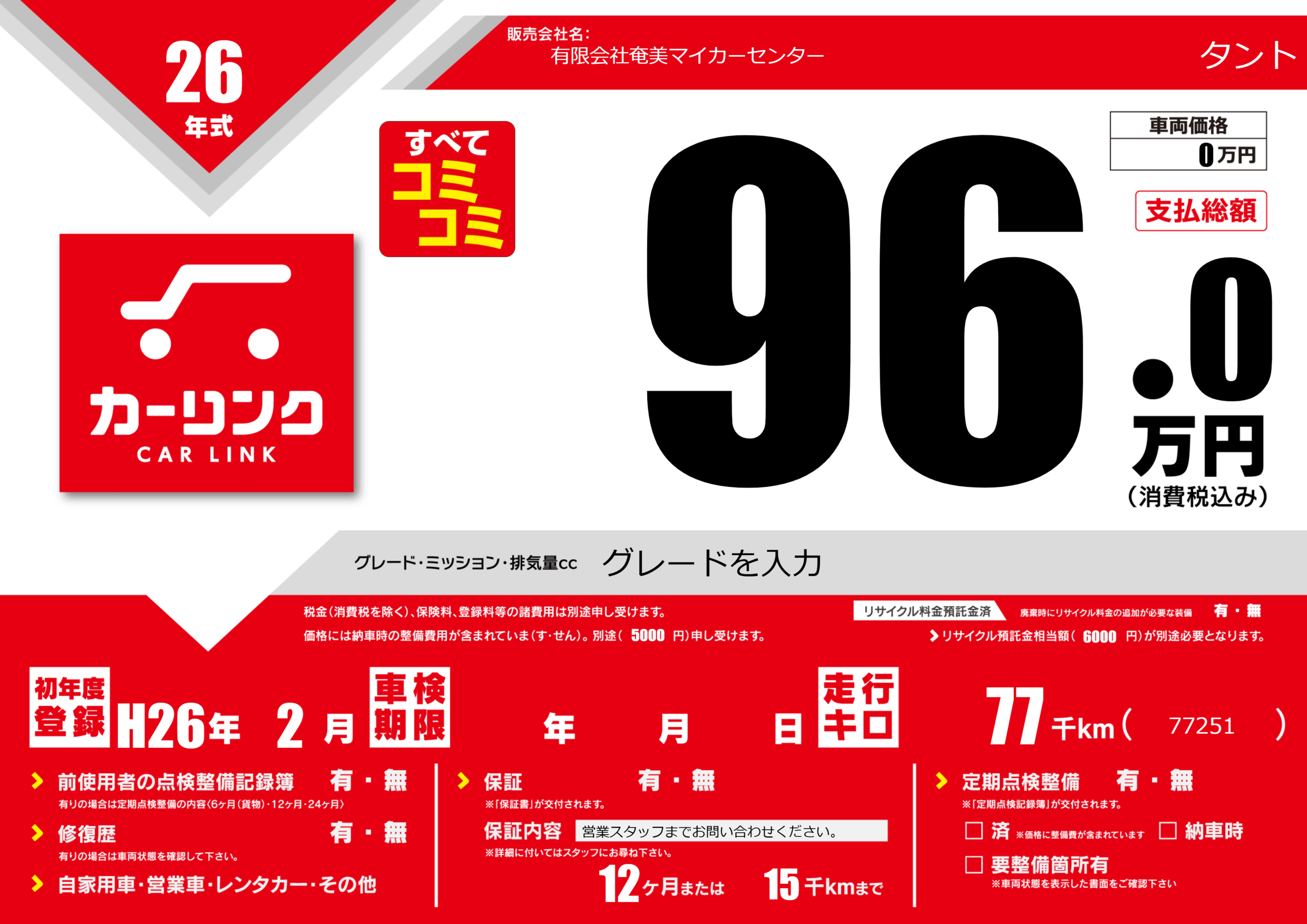 | 走行キロ | 7.7万km | 初年度登録 | H26年2月 |