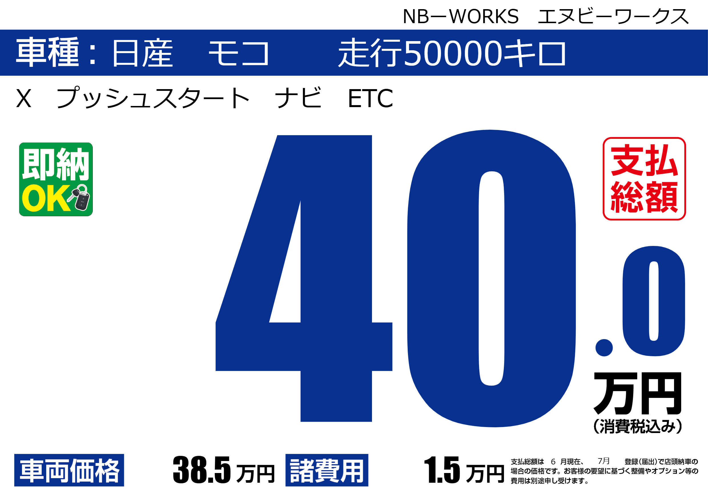| 車名 | 日産 モコ 走行50000キロ | グレード ミッション 排気量 |