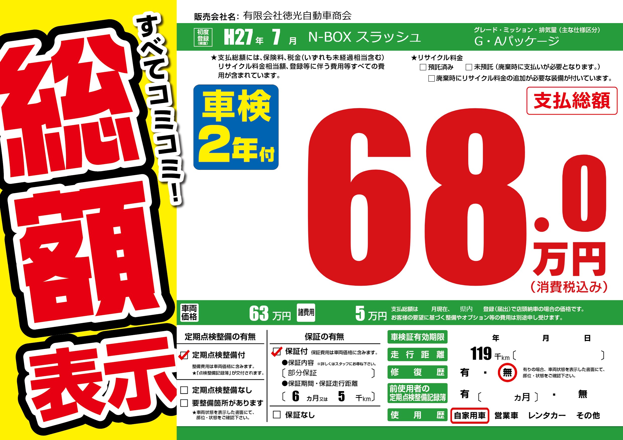 | 車名 | N-BOX スラッシュ | グレード ミッション 排気量 |