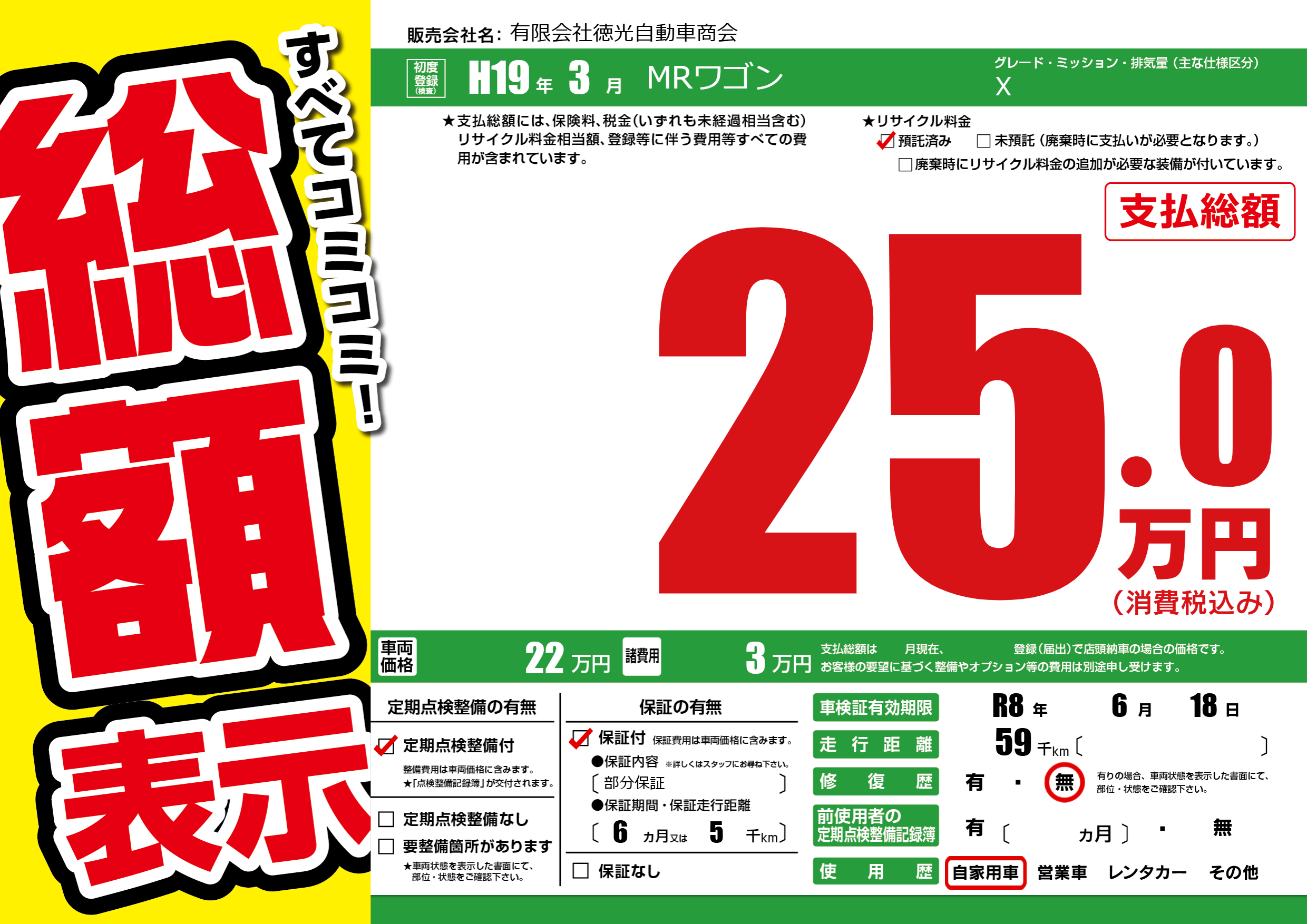 | 車名 | MRワゴン | グレード ミッション 排気量 |