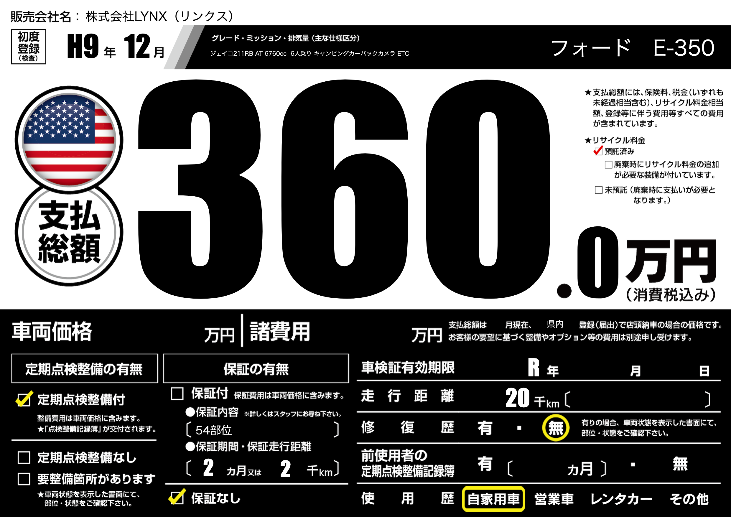 | 車名 | フォード E-350 | グレード ミッション 排気量 |