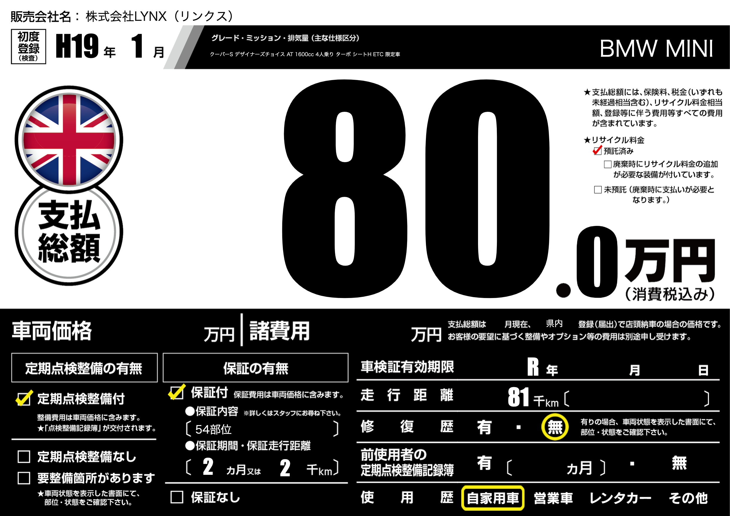 | 車名 | BMW MINI | グレード ミッション 排気量 |