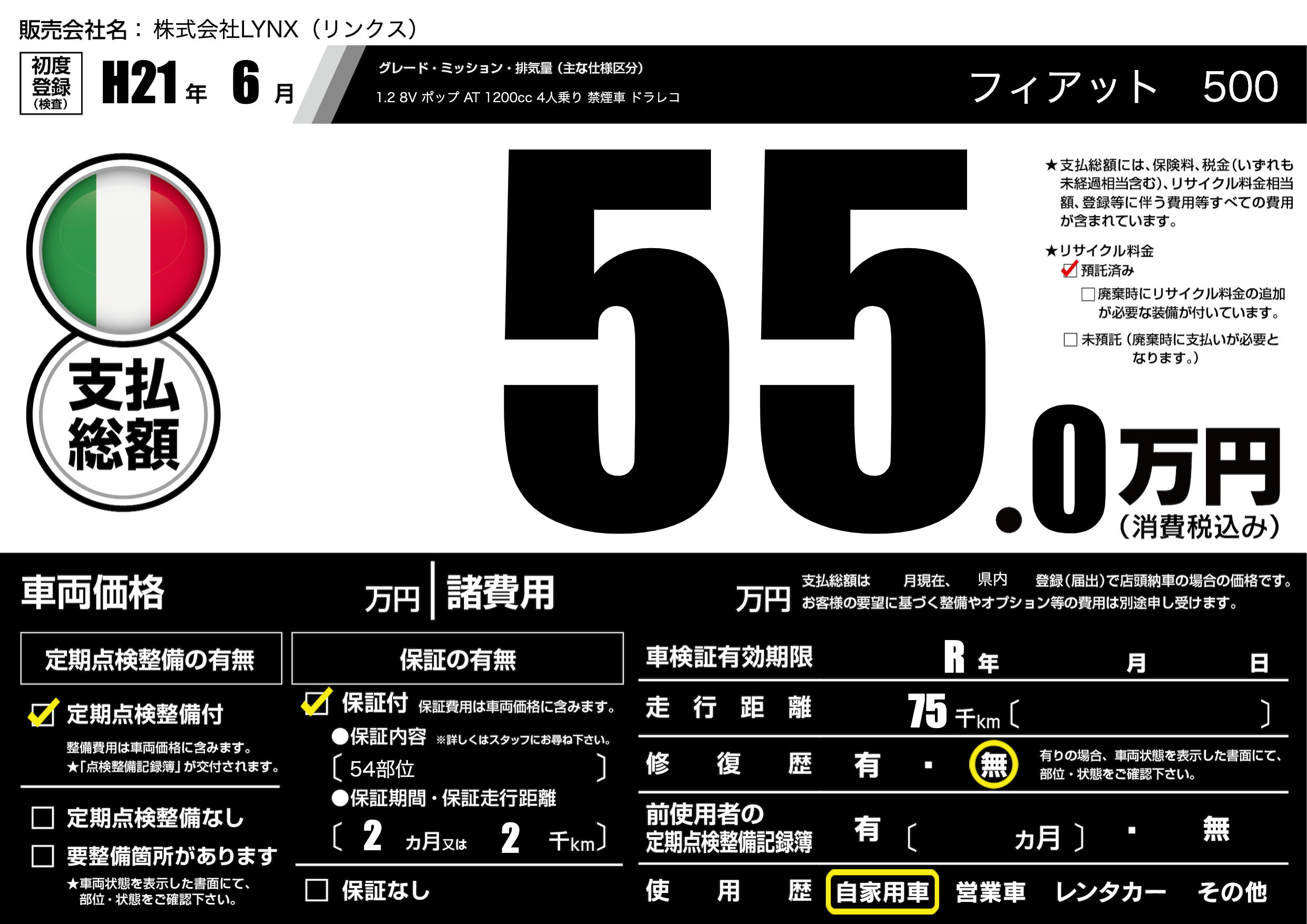 | 車名 | フィアット 500 | グレード ミッション 排気量 |