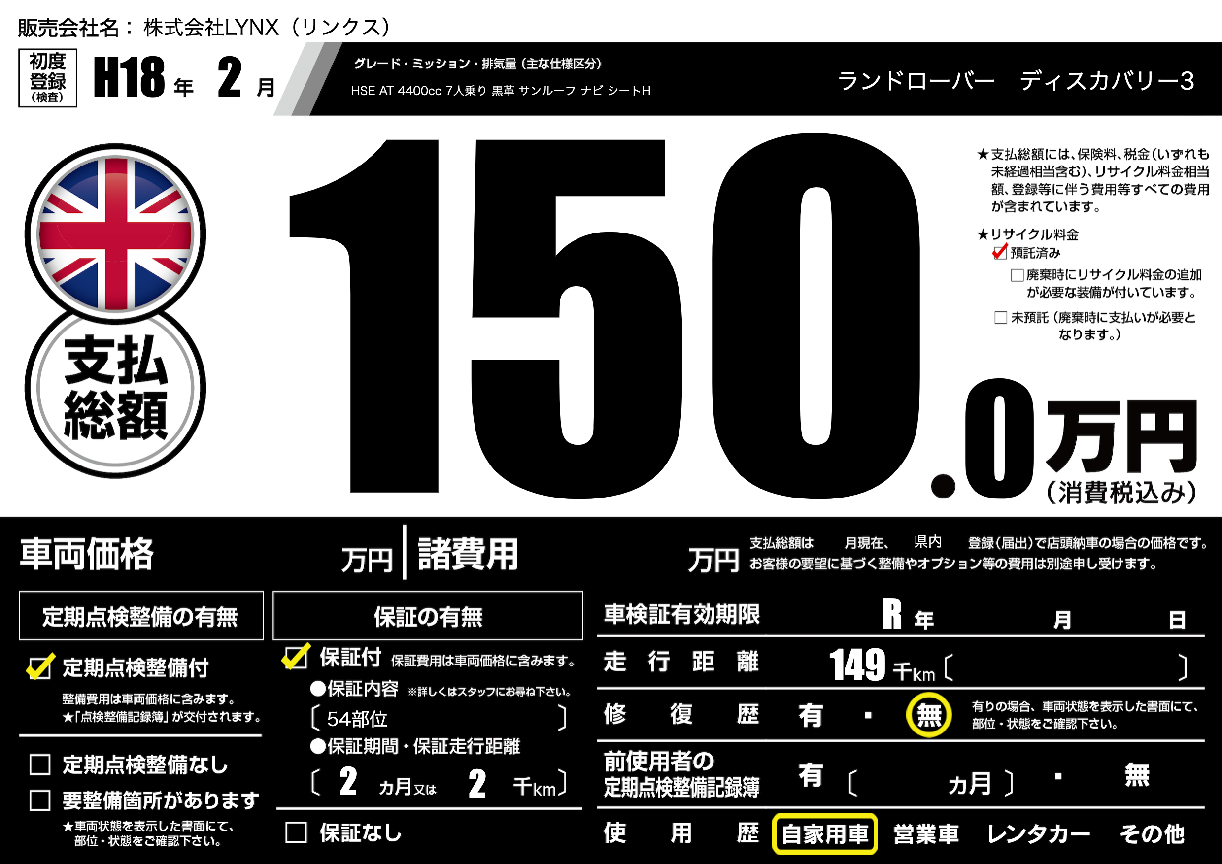 | 車名 | ランドローバー ディスカバリー3 | グレード ミッション 排気量 |