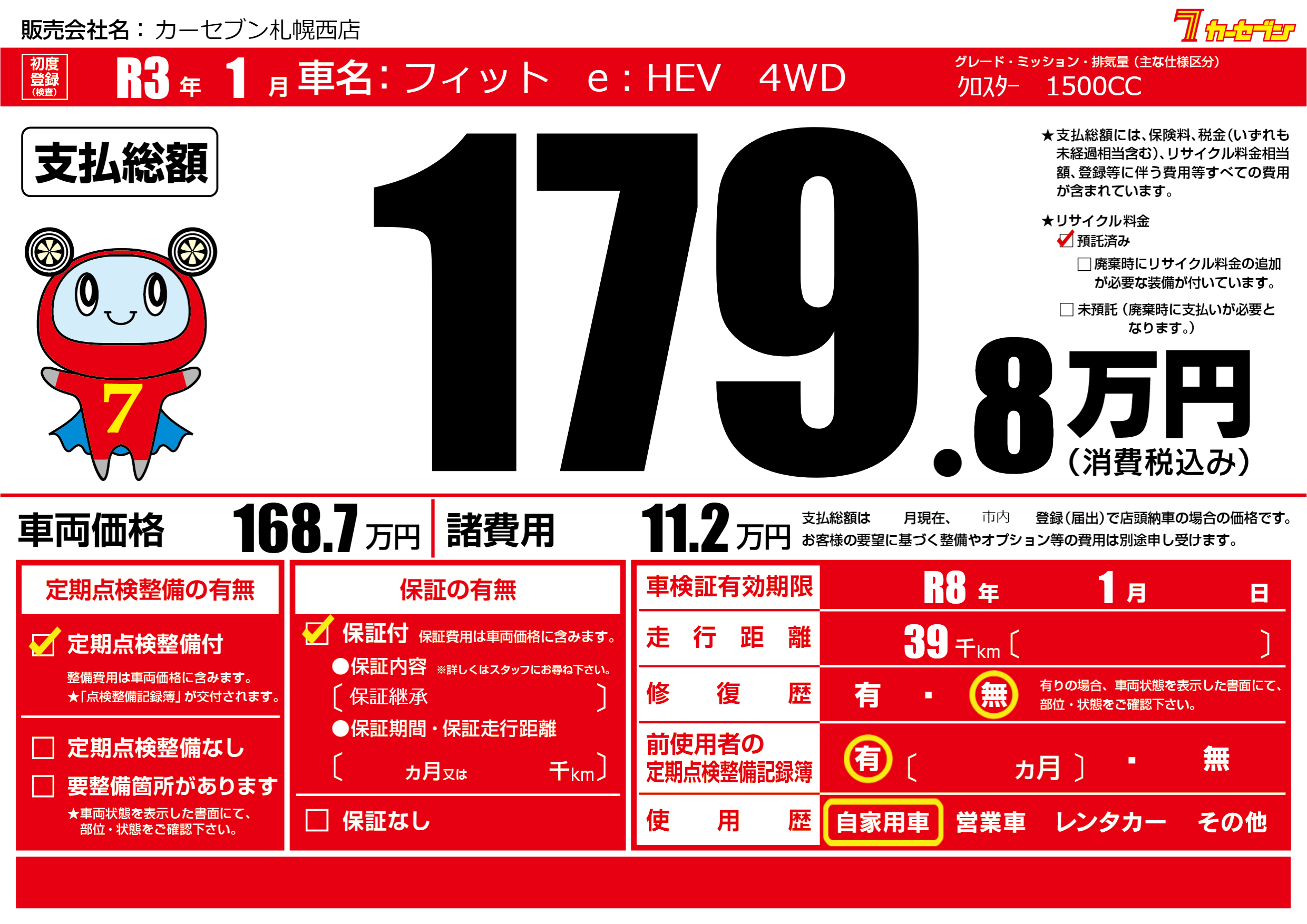 | 車名 | フィット e:HEV 4WD | グレード ミッション 排気量 |