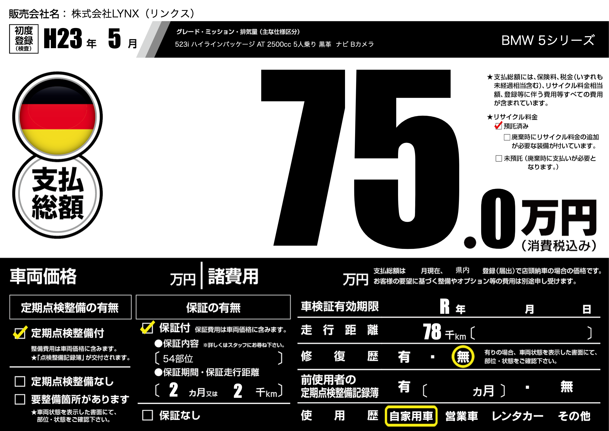 | 車名 | BMW 5シリーズ | グレード ミッション 排気量 |