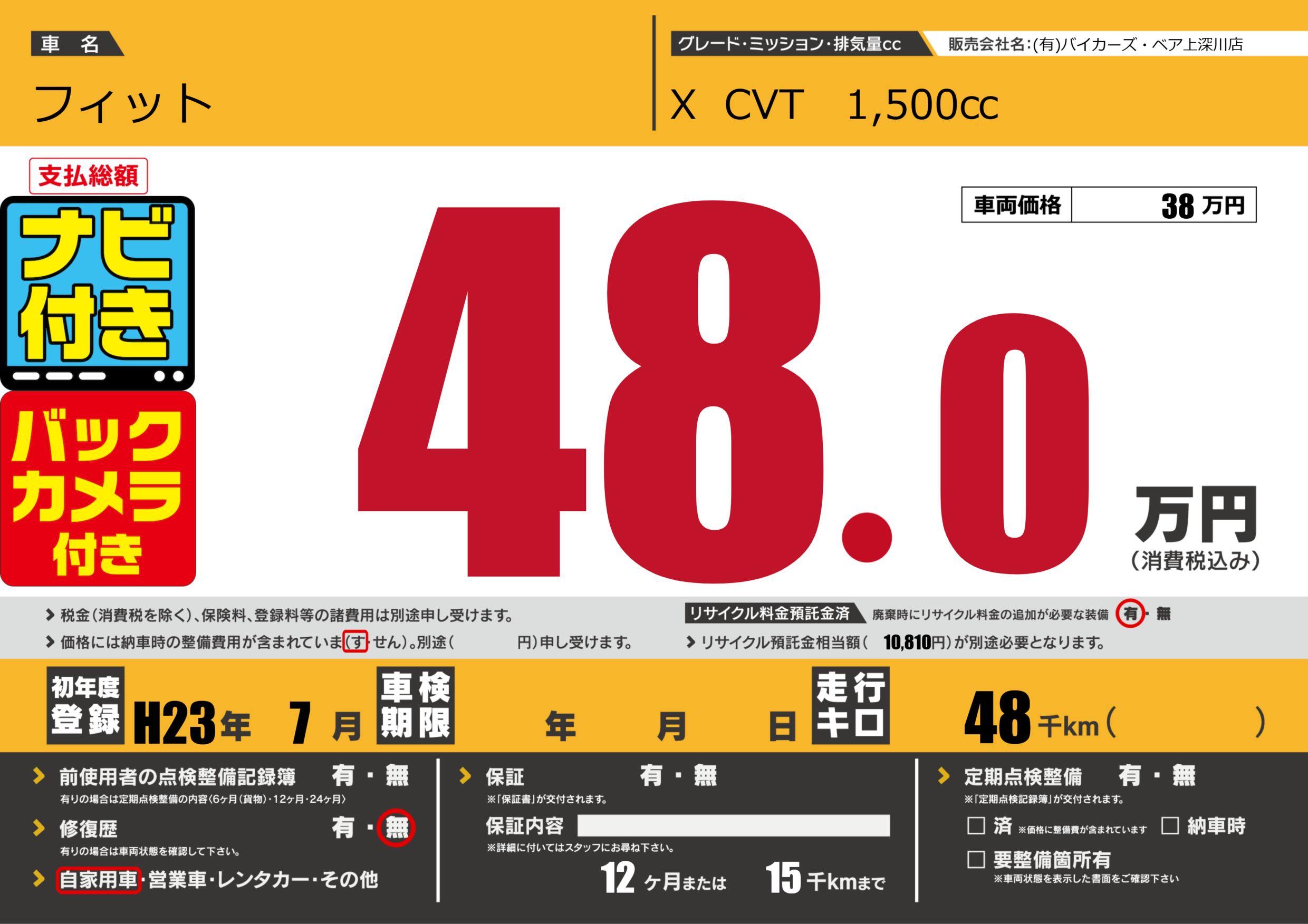 | 走行キロ | 4.8万km | 初年度登録 | H23年7月 |