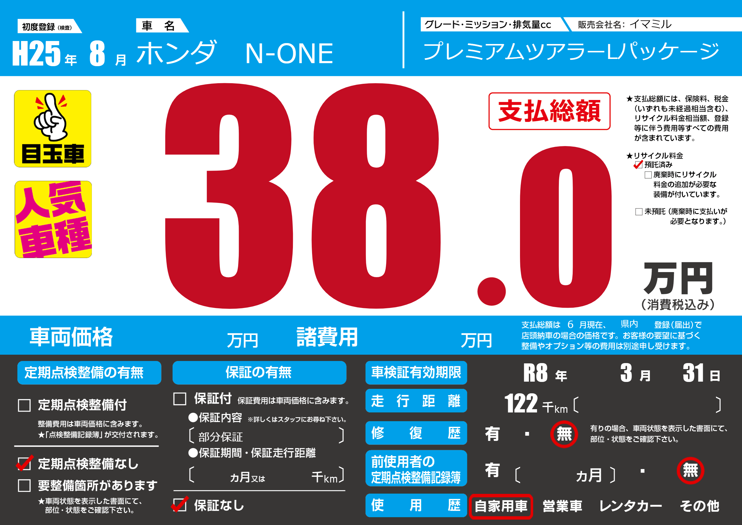 | 車名 | ホンダ N-ONE | グレード ミッション 排気量 |