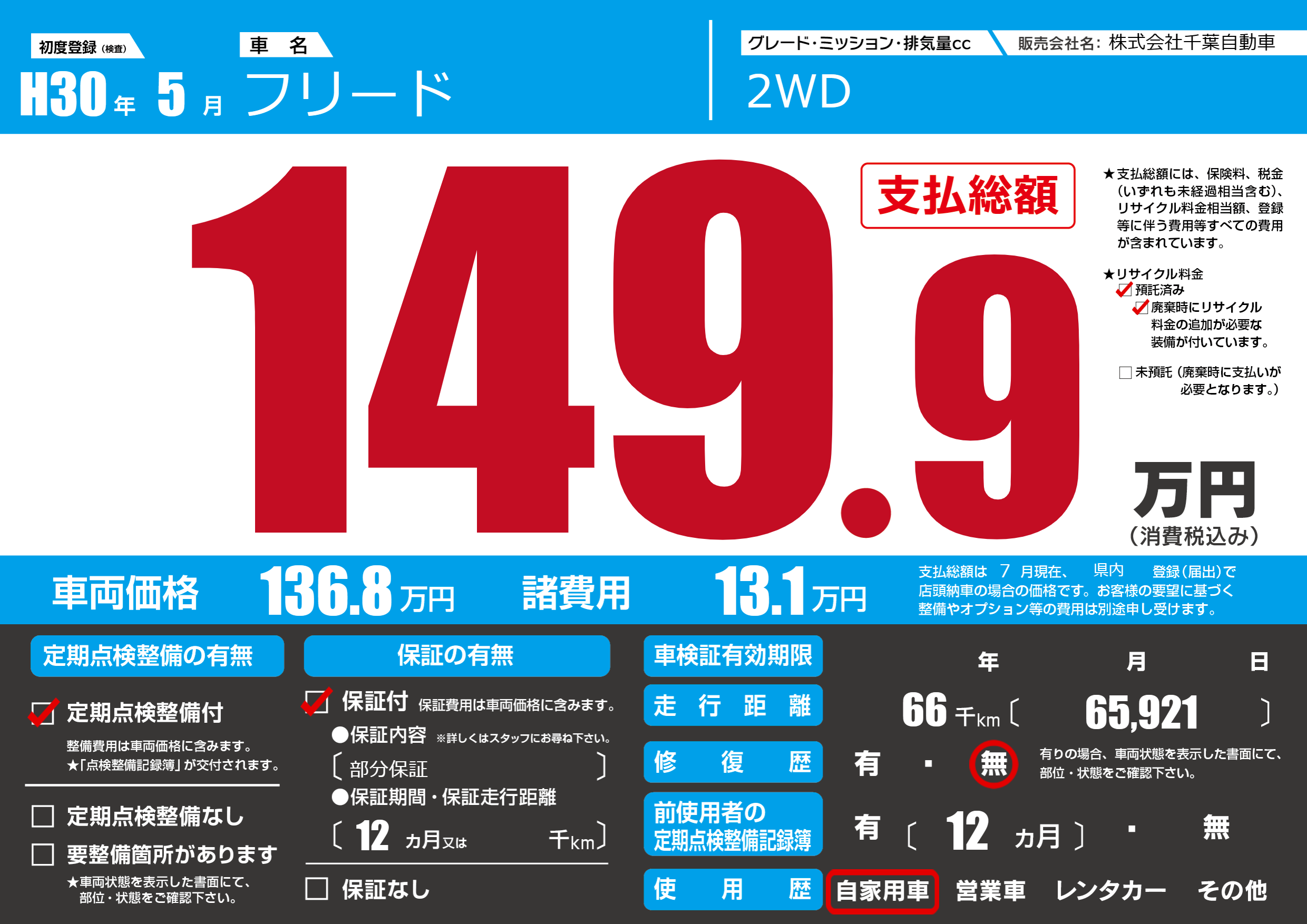 | 走行キロ | 6.6万km | 初年度登録 | H30年5月 |