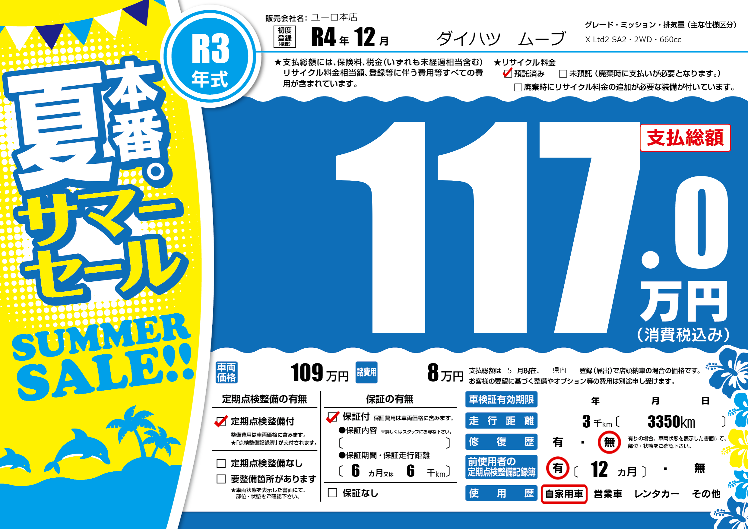 | 走行キロ | 0.3万km | 初年度登録 | R4年12月 |