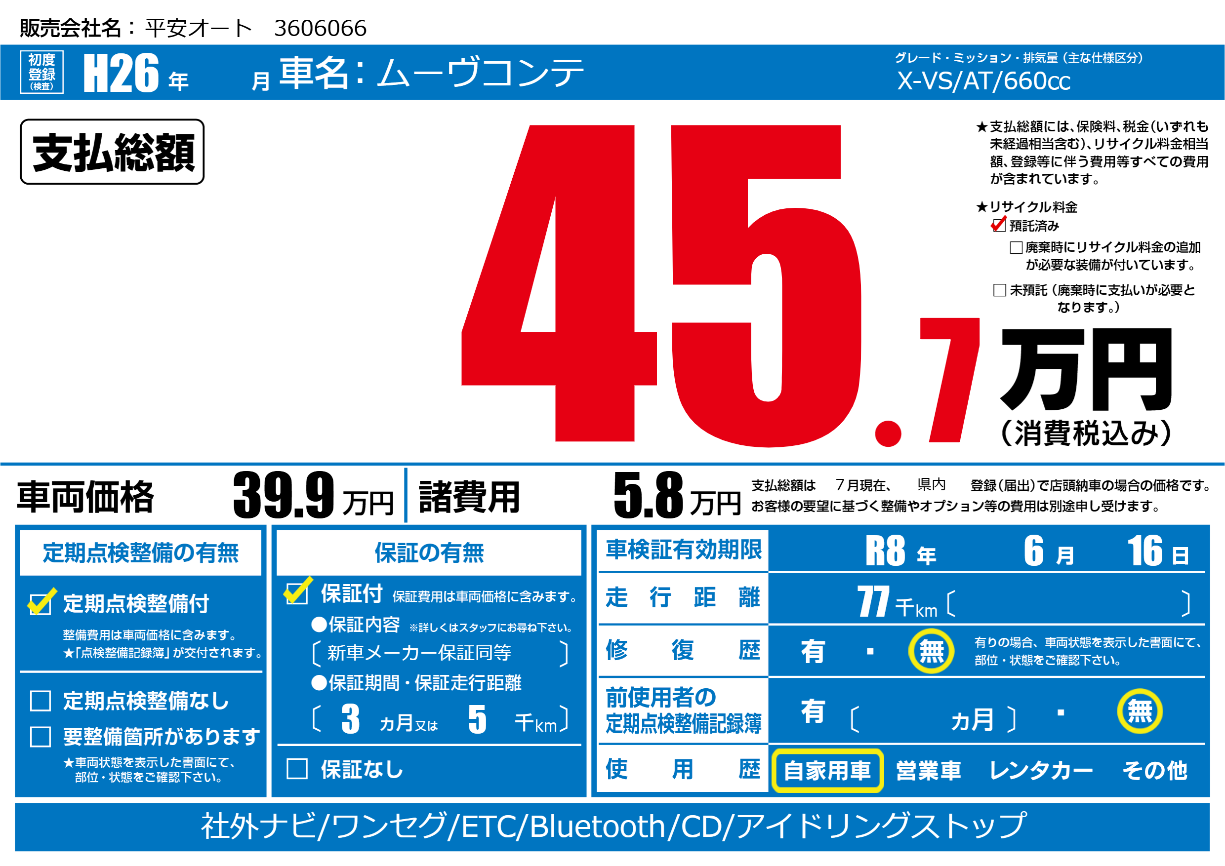 | 車名 | ムーヴコンテ | グレード ミッション 排気量 |
