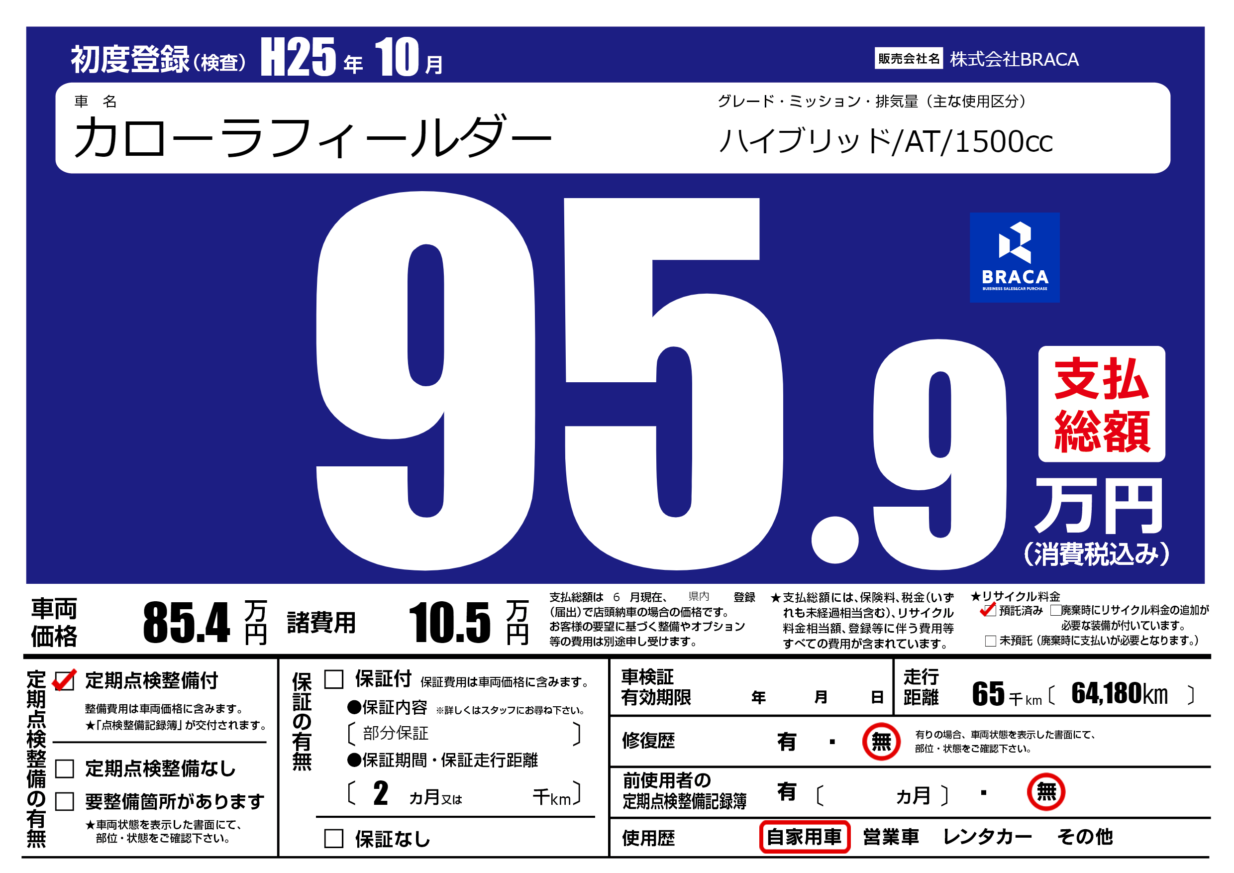 | 走行キロ | 6.5万km | 初年度登録 | H25年10月 |