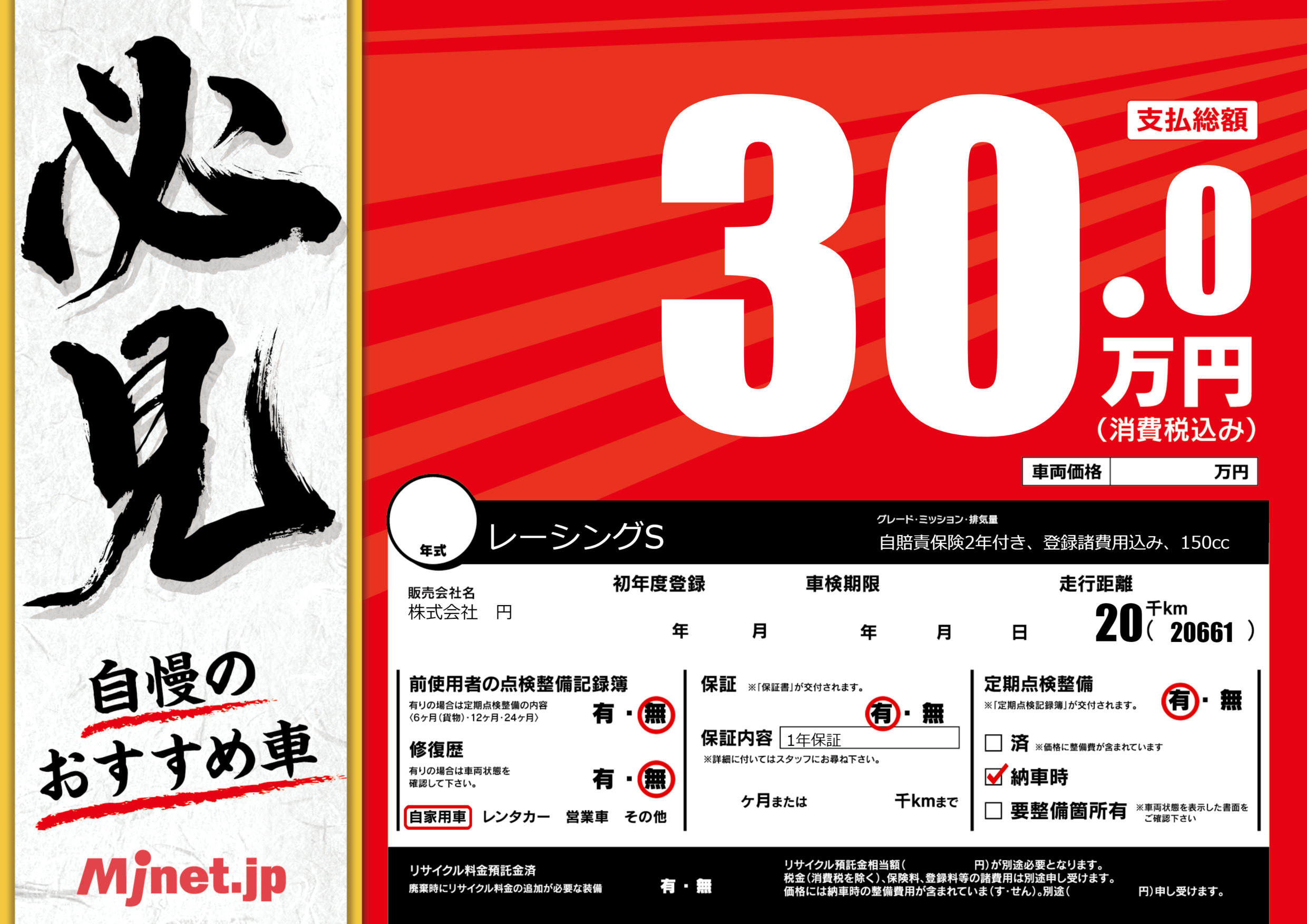 自賠責保険2年付き、登録諸費用込み、150cc |