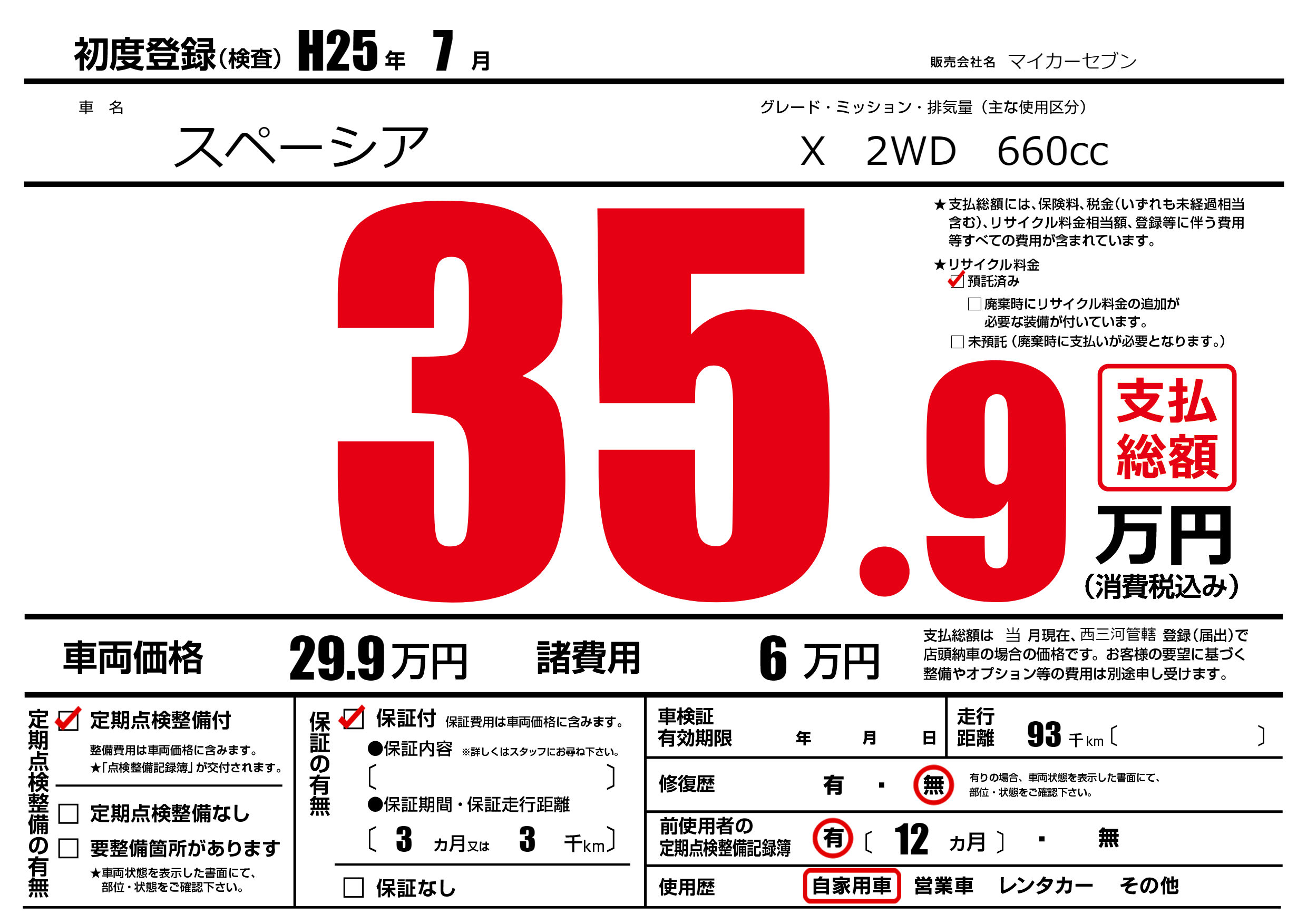 | 走行キロ | 9.3万km | 初年度登録 | H25年7月 |