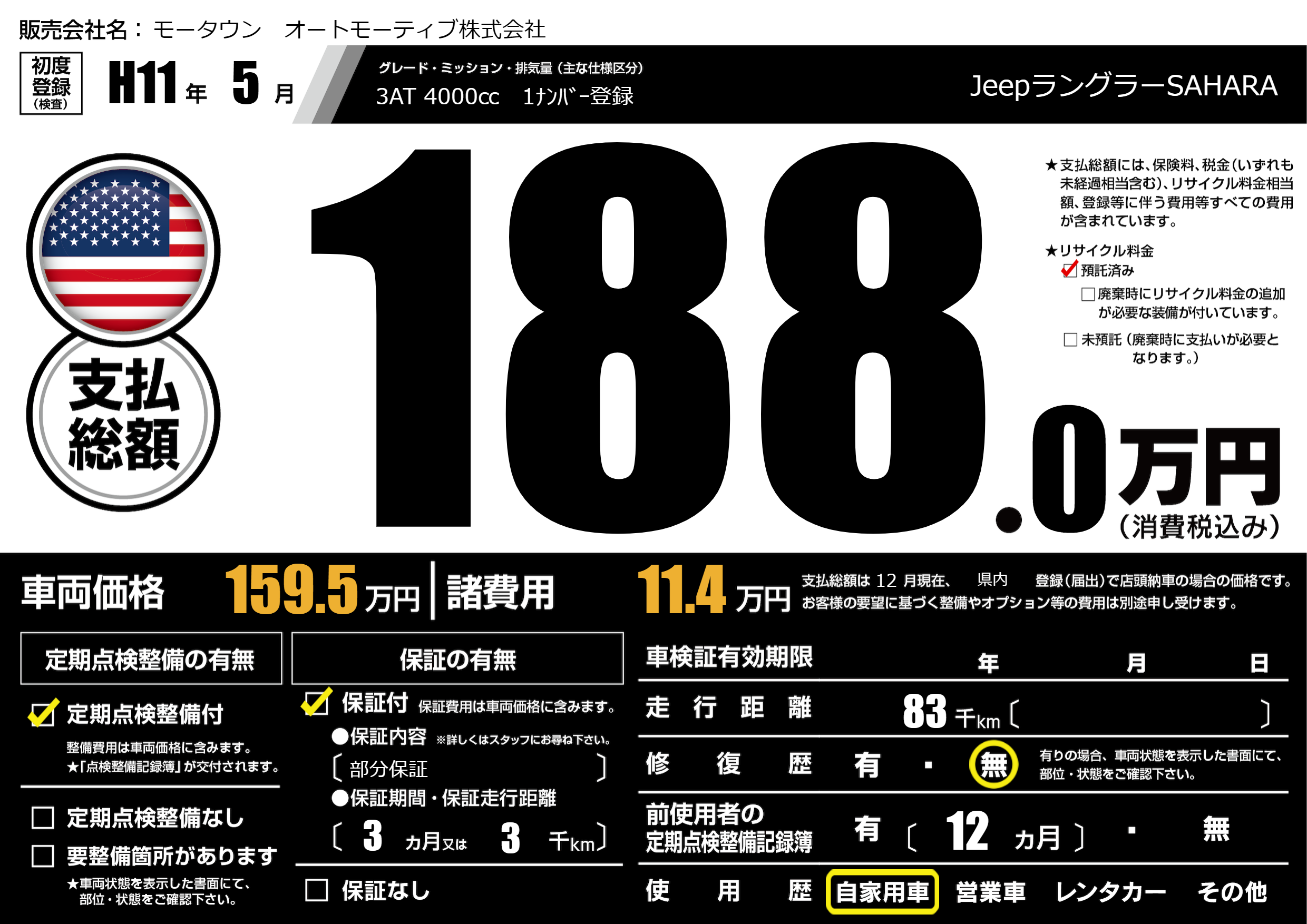 | 車名 | JeepラングラーSAHARA | グレード ミッション 排気量 |