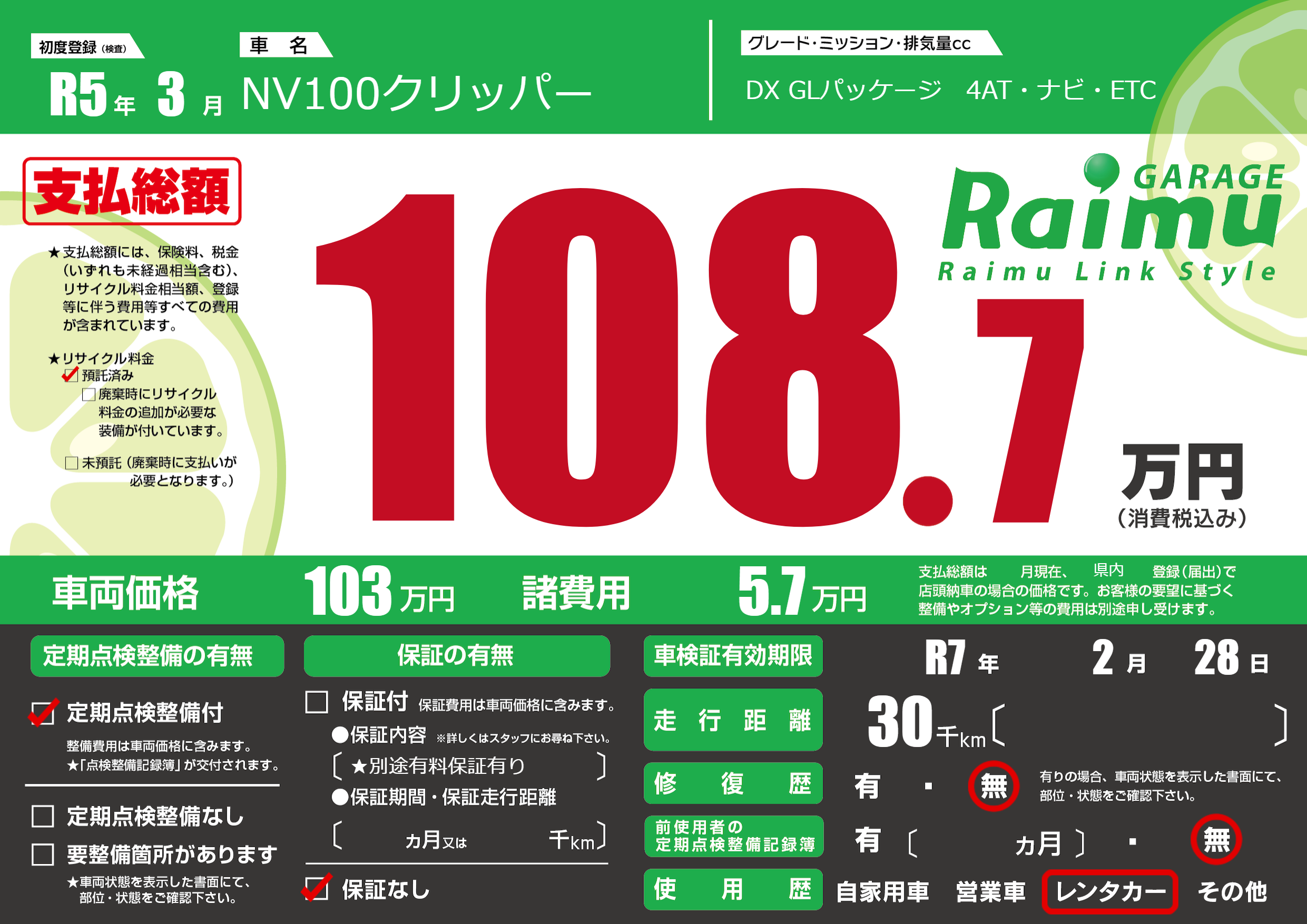 | 走行キロ | 3万km | 初年度登録 | R5年3月 |
