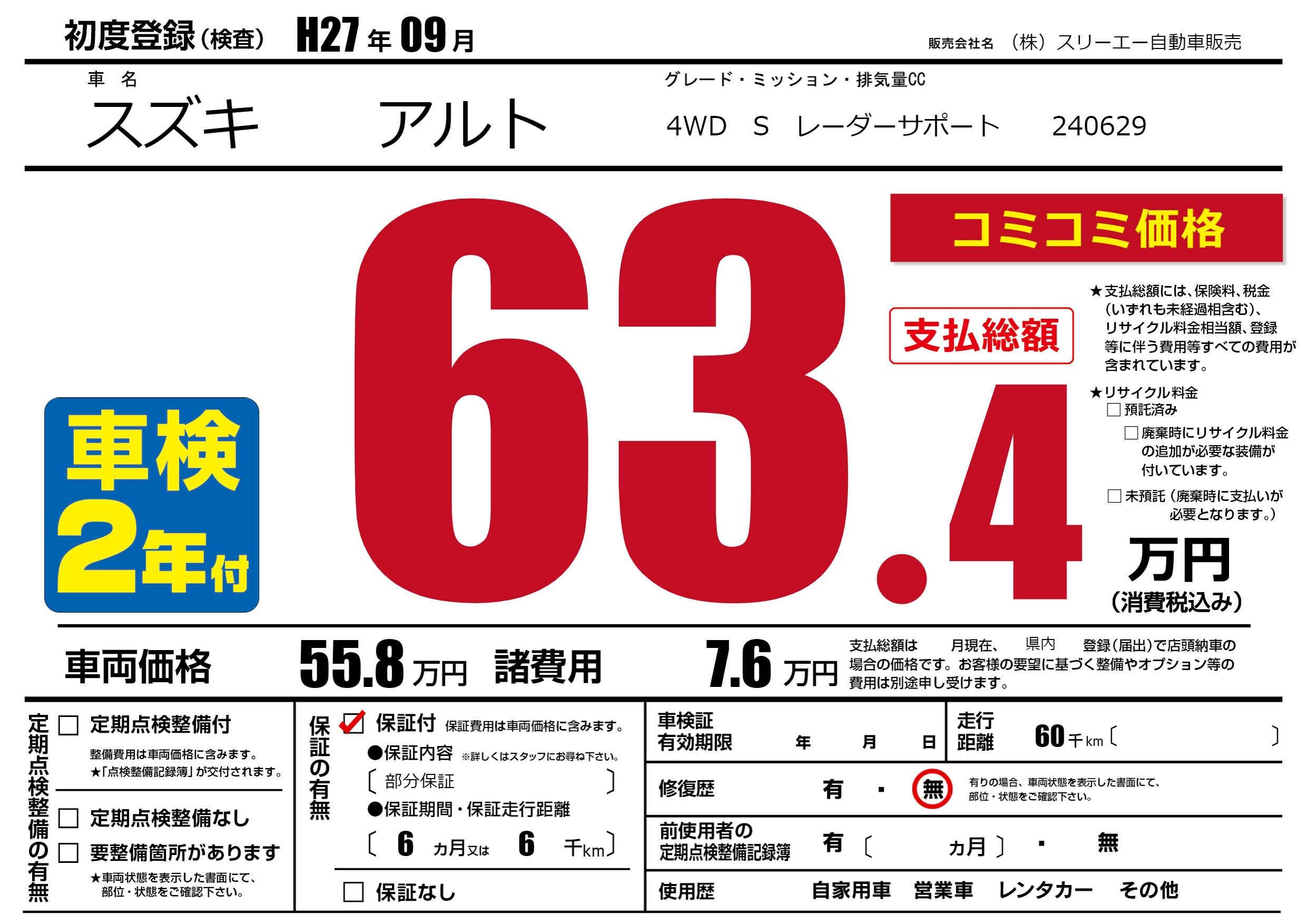 | 車名 | スズキ アルト | グレード ミッション 排気量 |