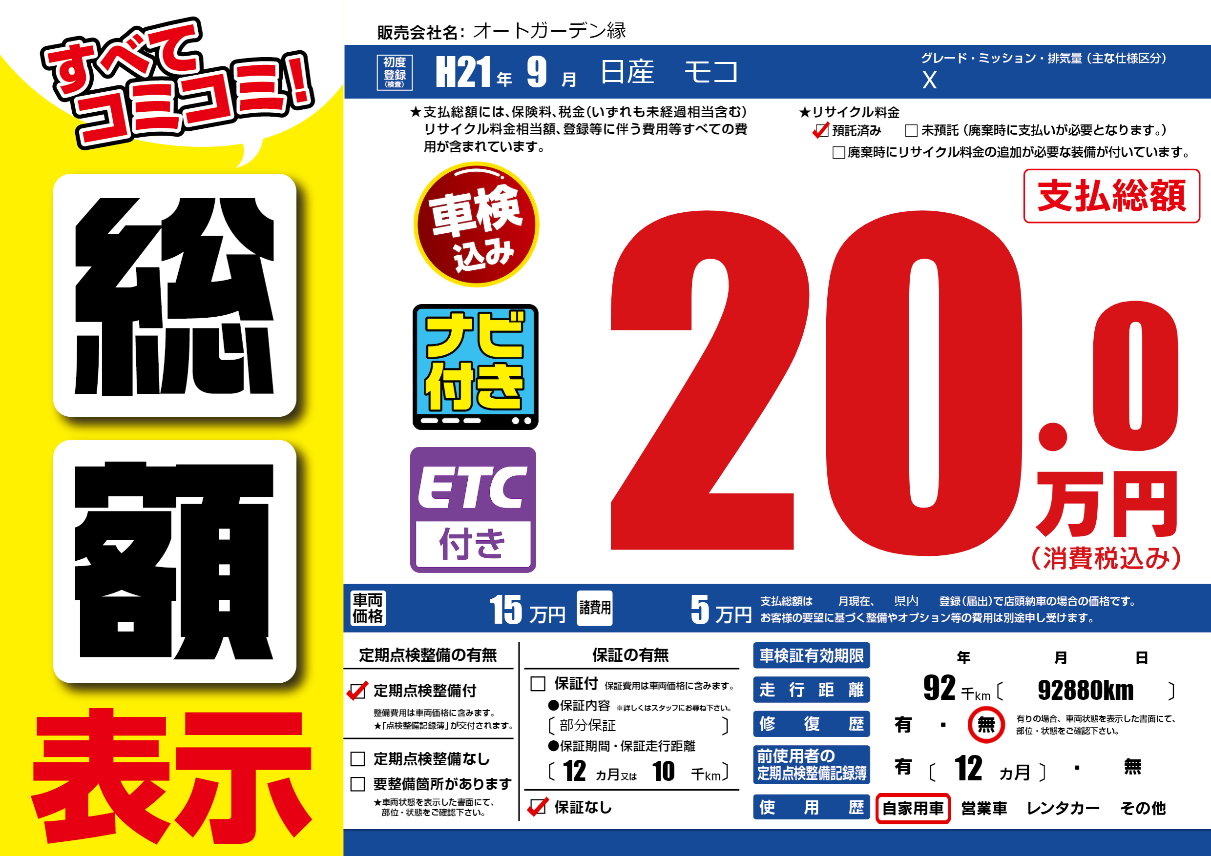 | 車名 | 日産 モコ | グレード ミッション 排気量 |