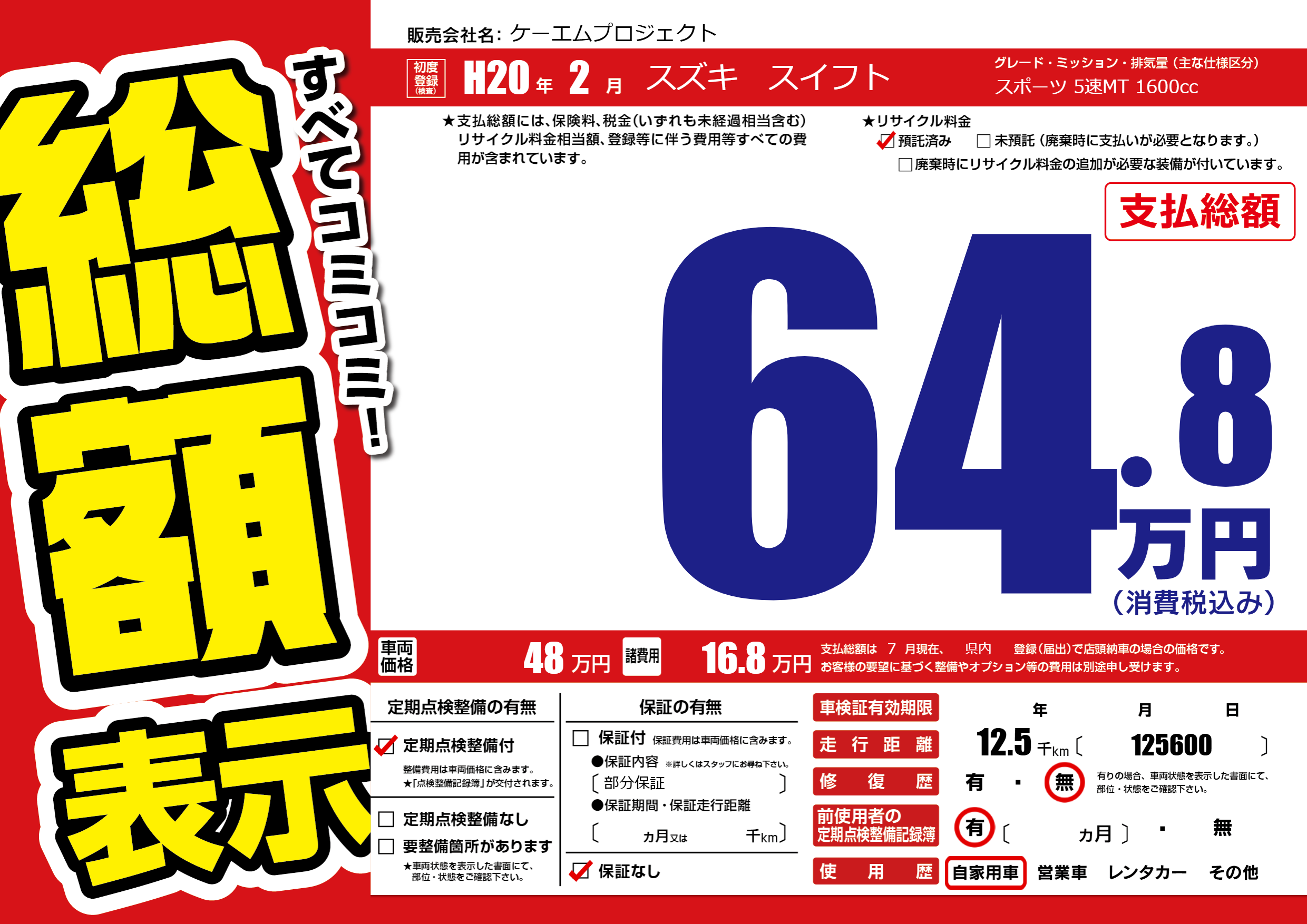 | 車名 | スズキ スイフト | グレード ミッション 排気量 |