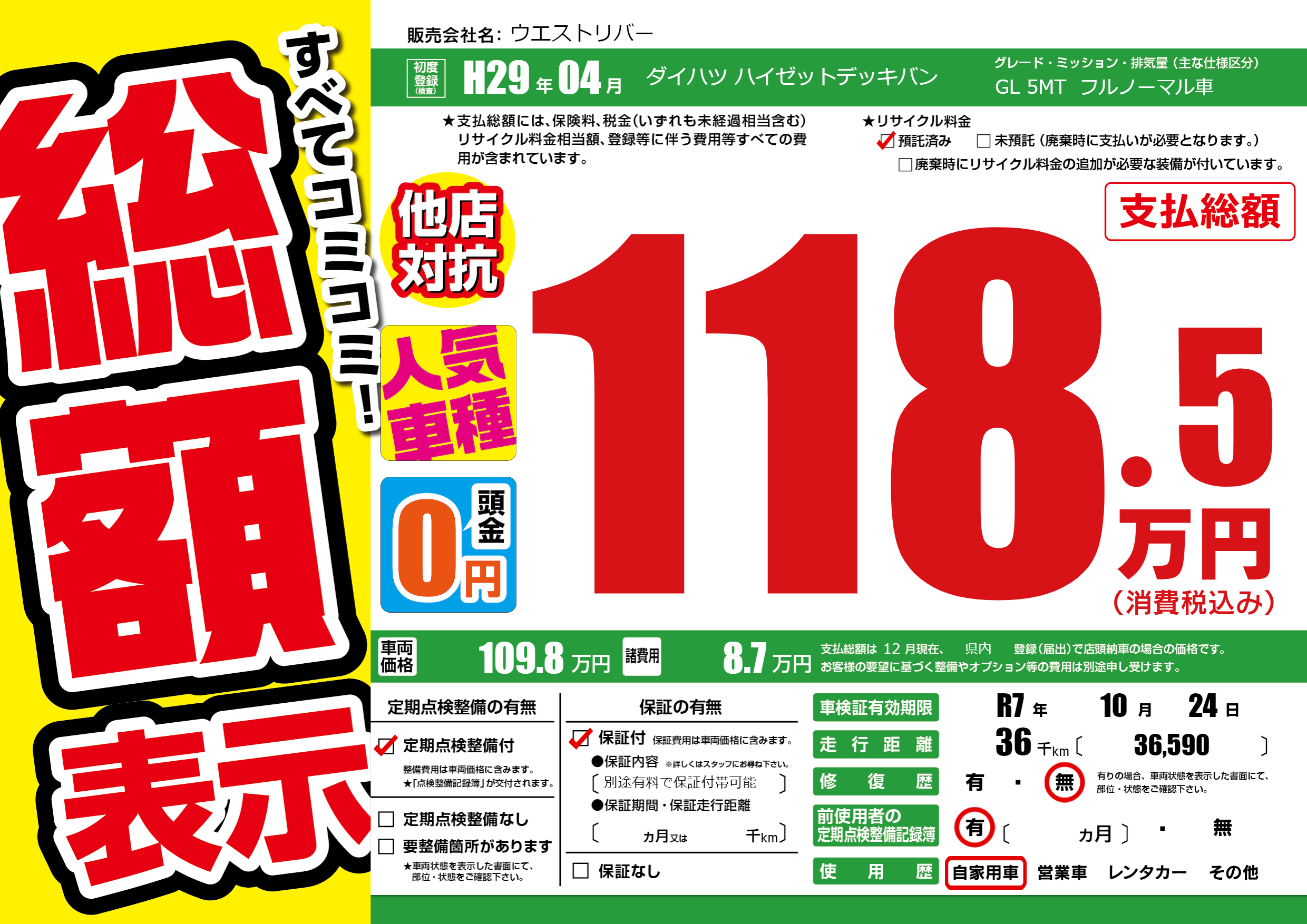 | 走行キロ | 3.6万km | 初年度登録 | H29年04月 |