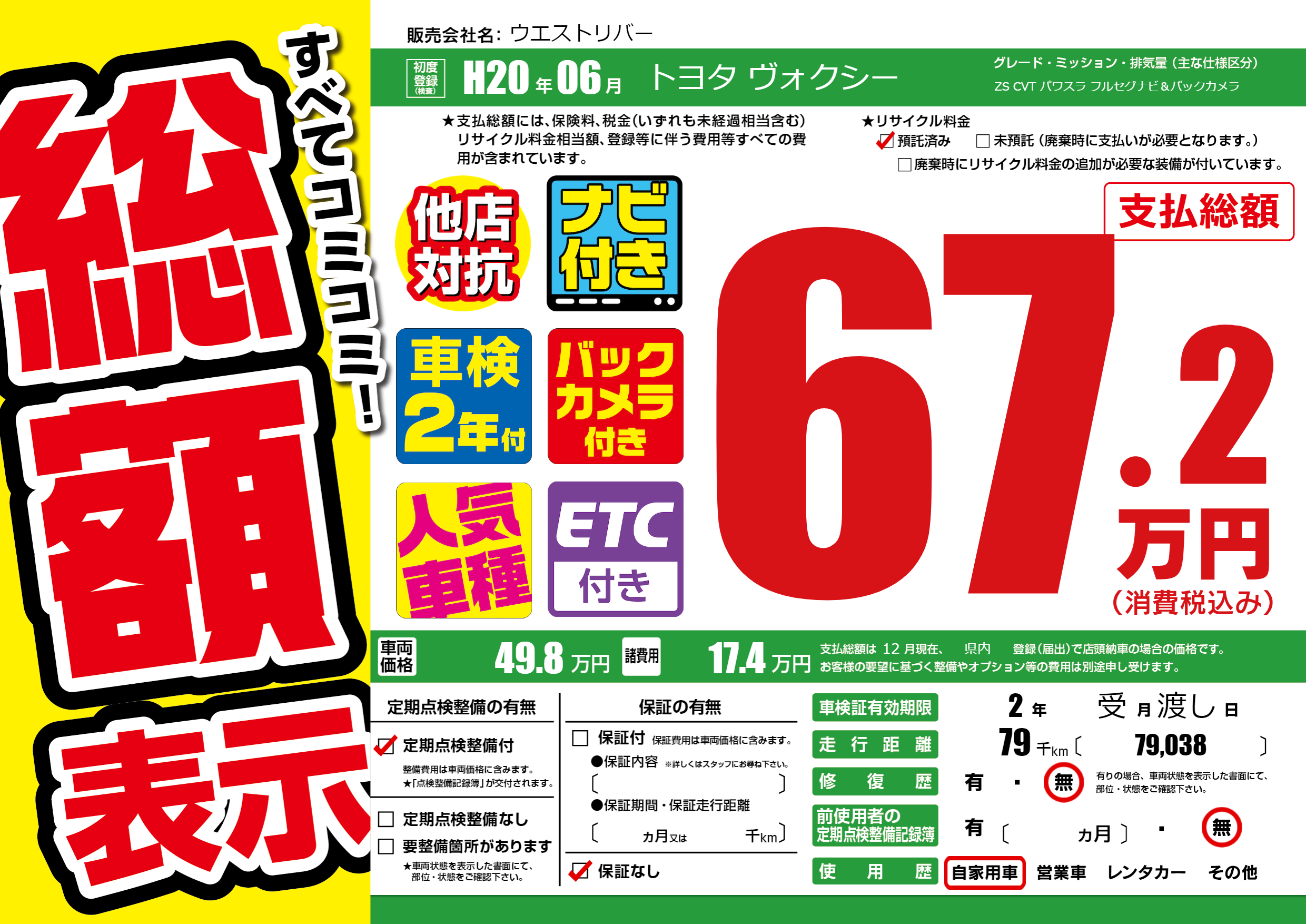 | 走行キロ | 7.9万km | 初年度登録 | H20年06月 |