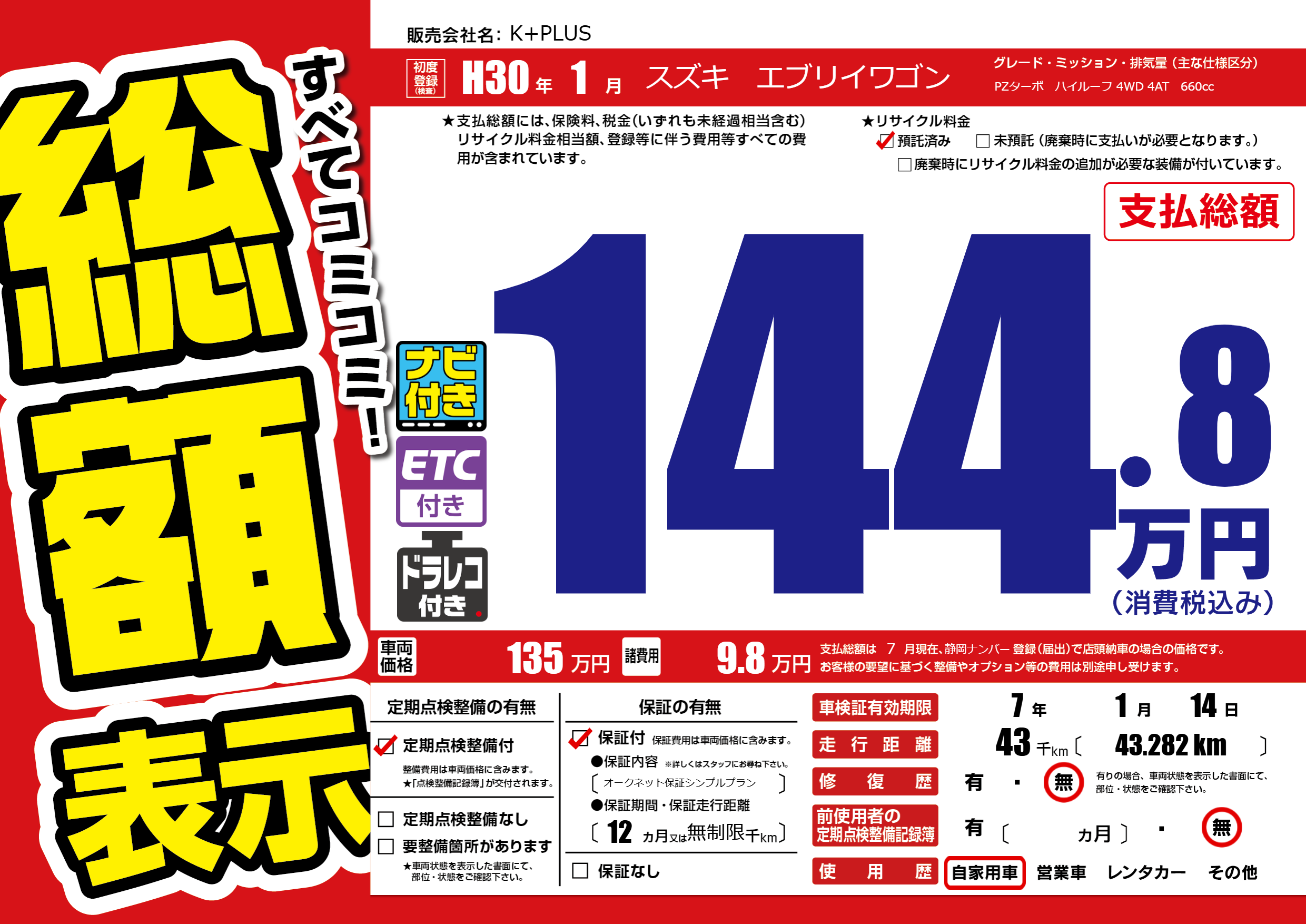 | 車名 | スズキ エブリイワゴン | グレード ミッション 排気量 |