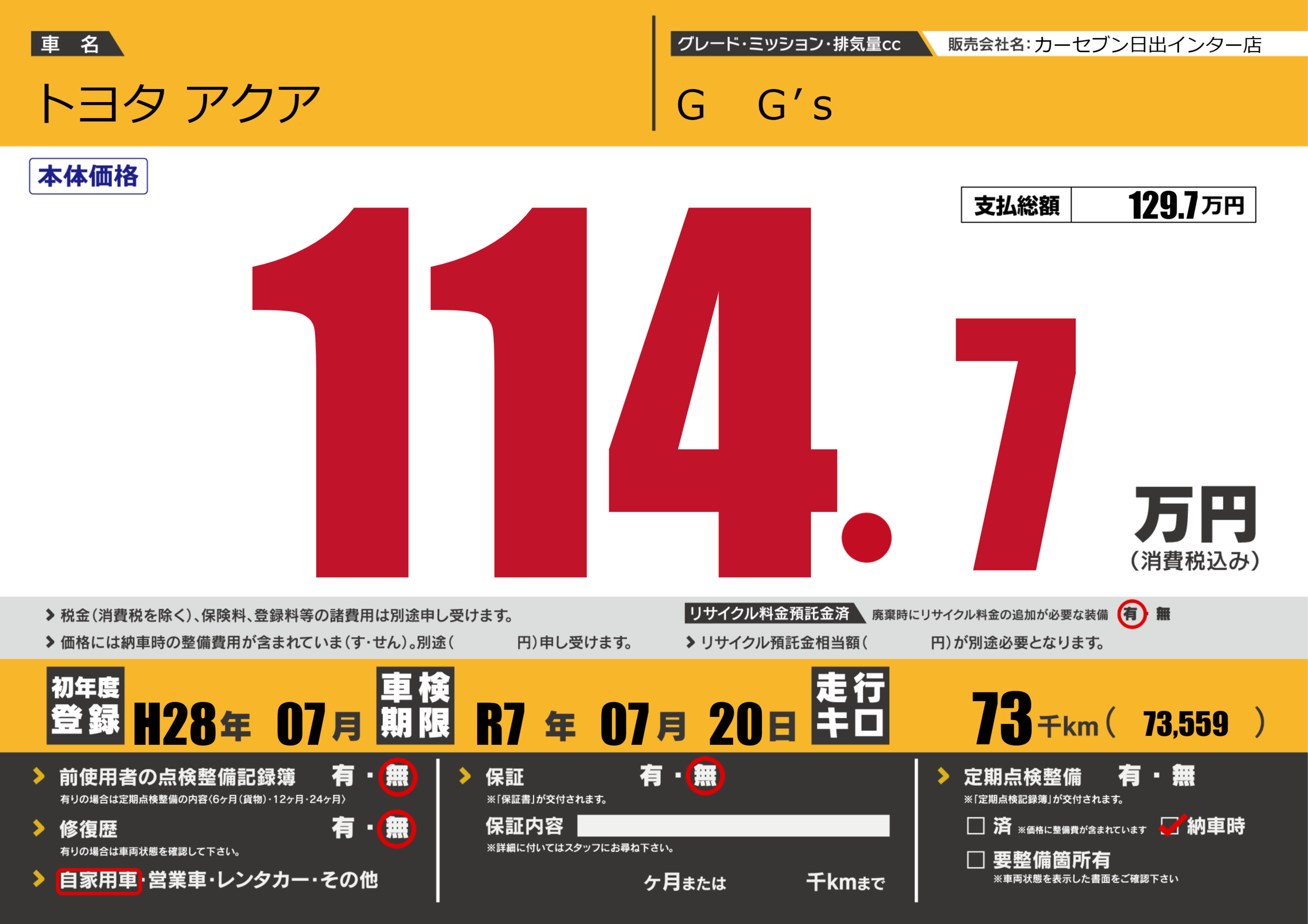 | 車名 | トヨタ アクア | グレード ミッション 排気量 |