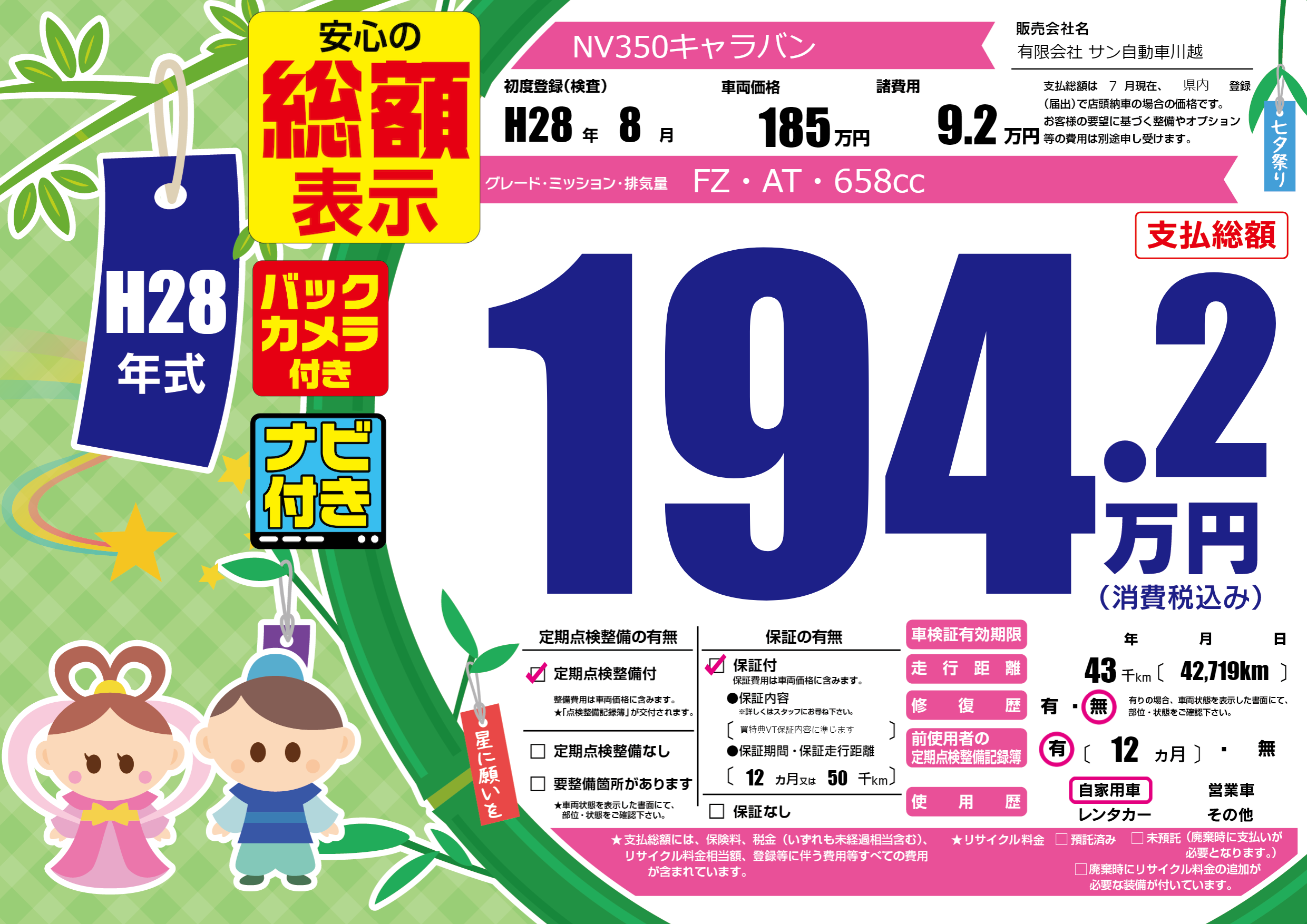 | 走行キロ | 4.3万km | 初年度登録 | H28年8月 |
