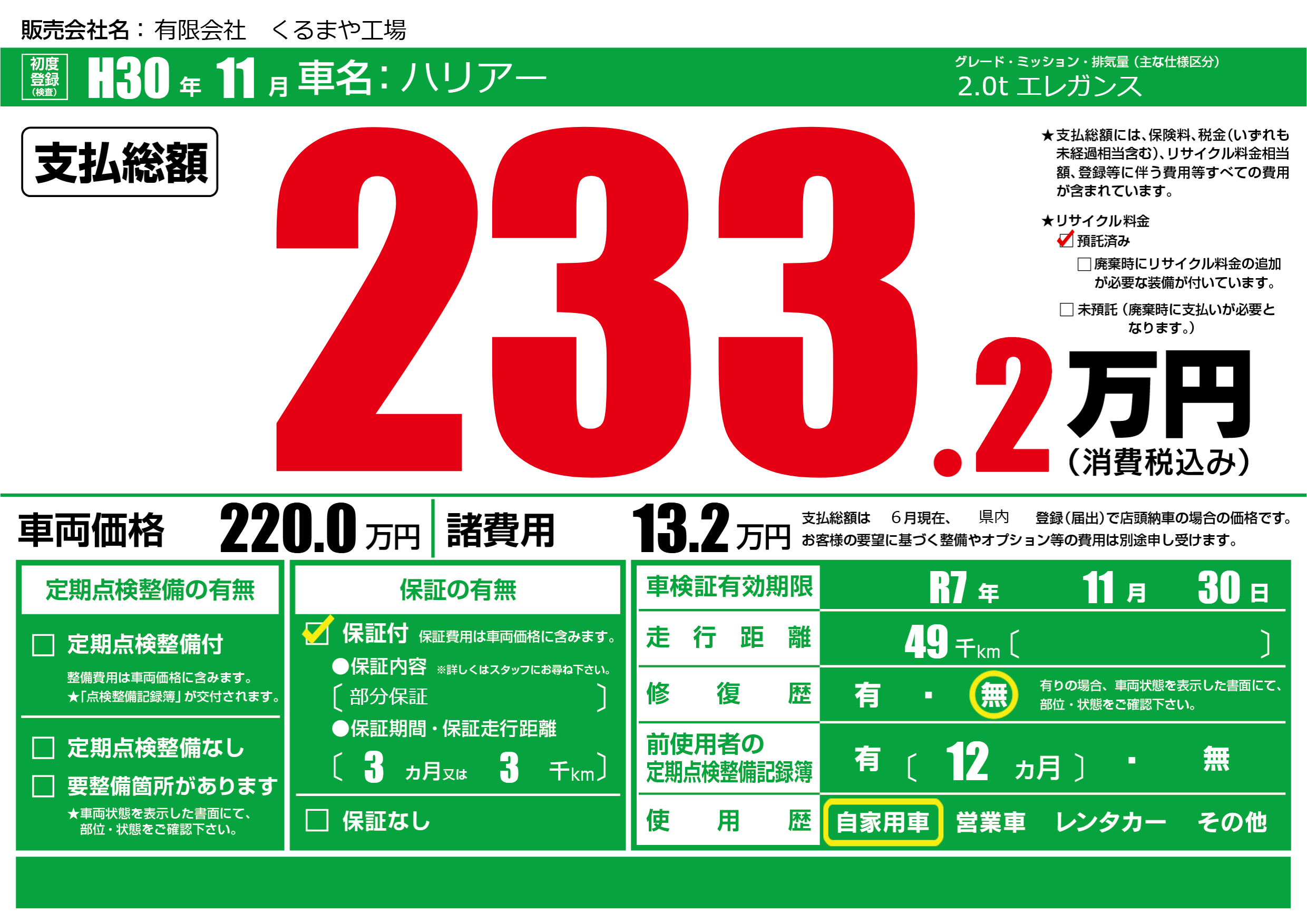 | 車検制限 | R7年 11月 30日 | ||