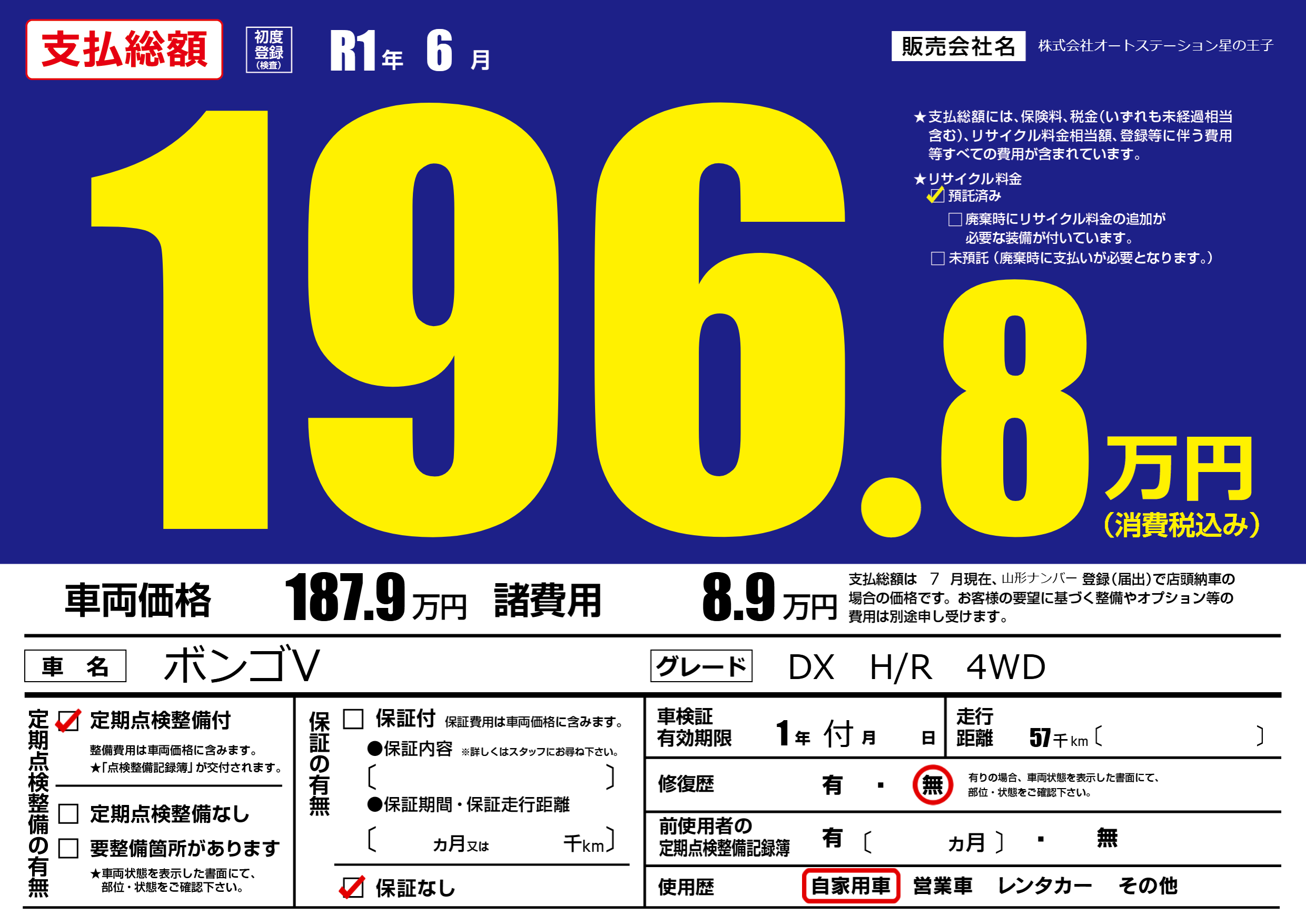 | 車名 | ボンゴV | グレード ミッション 排気量 |