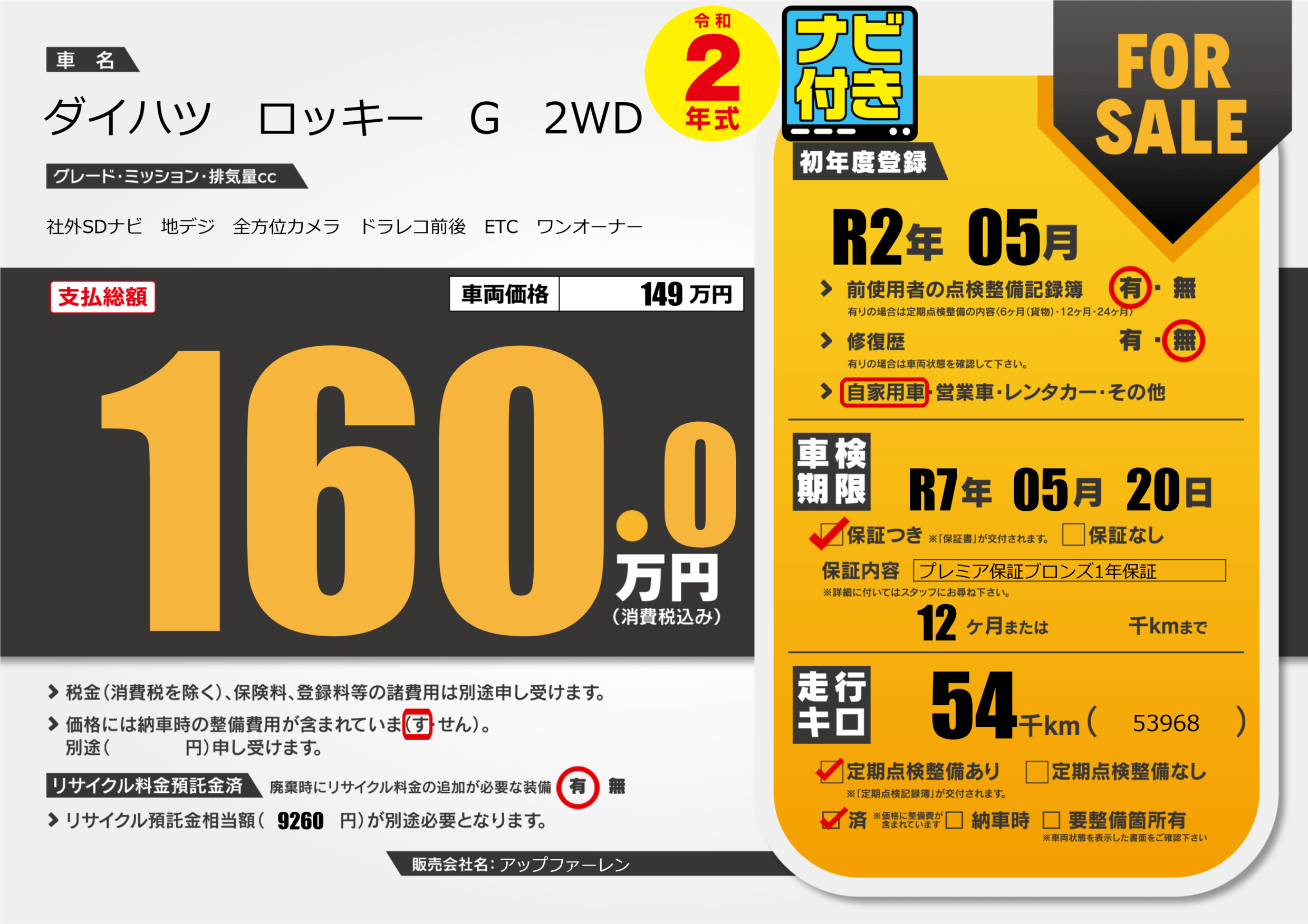 | 車名 | ダイハツ ロッキー G 2WD | グレード ミッション 排気量 |