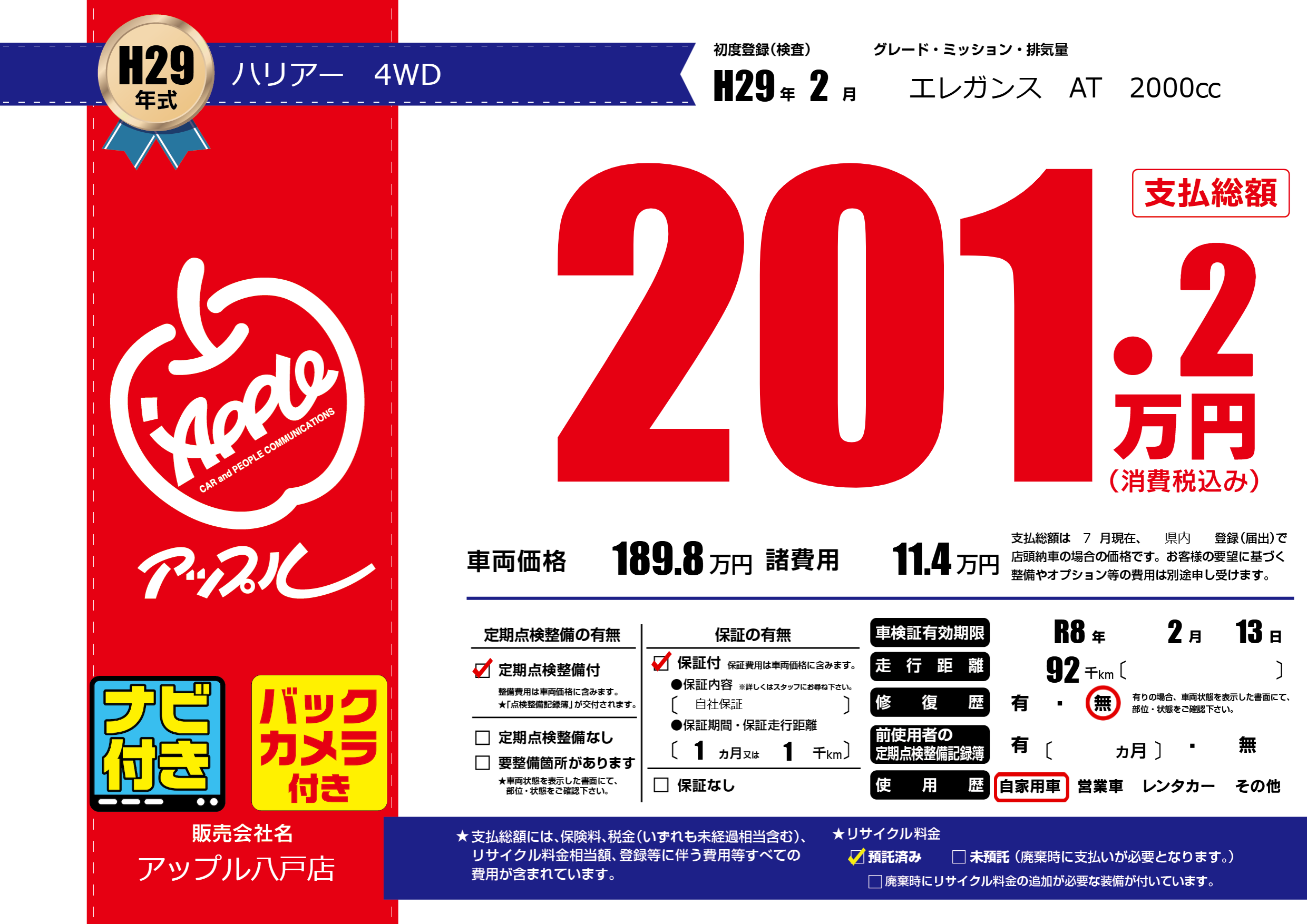 | 走行キロ | 9.2万km | 初年度登録 | H29年2月 |