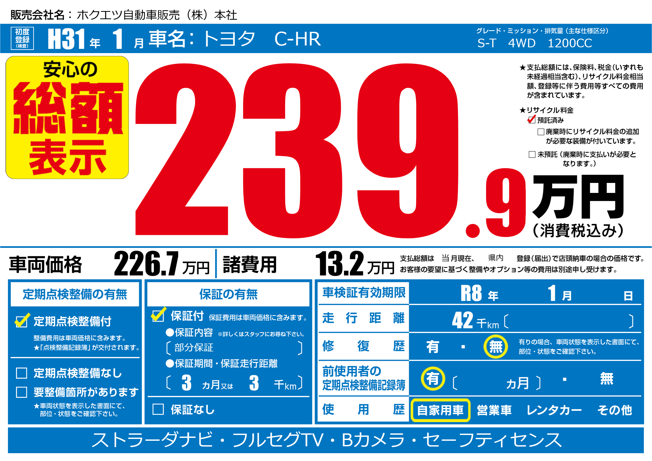 | 車名 | トヨタ C-HR | グレード ミッション 排気量 |