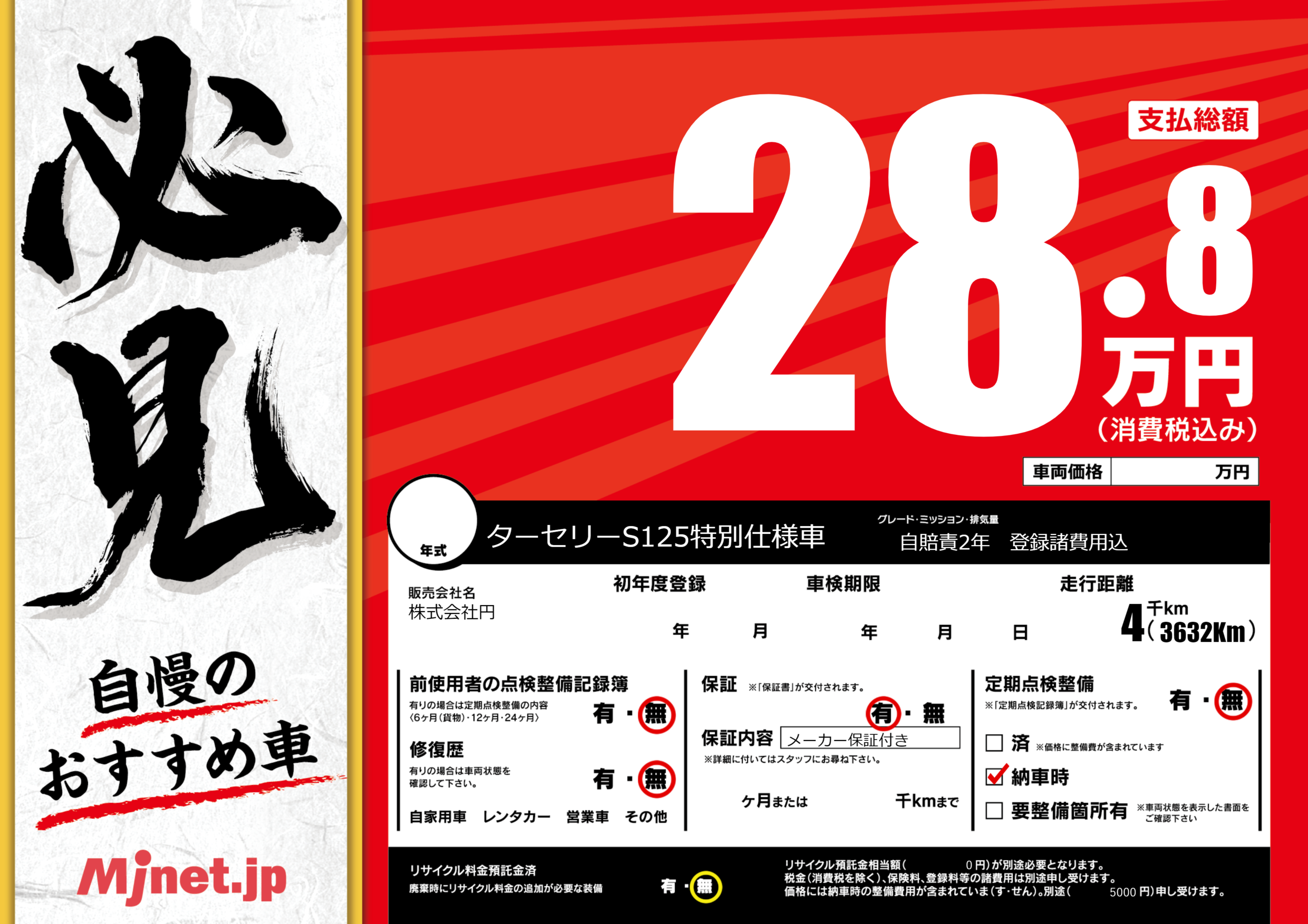 | 車名 | ターセリーS125特別仕様車 | グレード ミッション 排気量 |