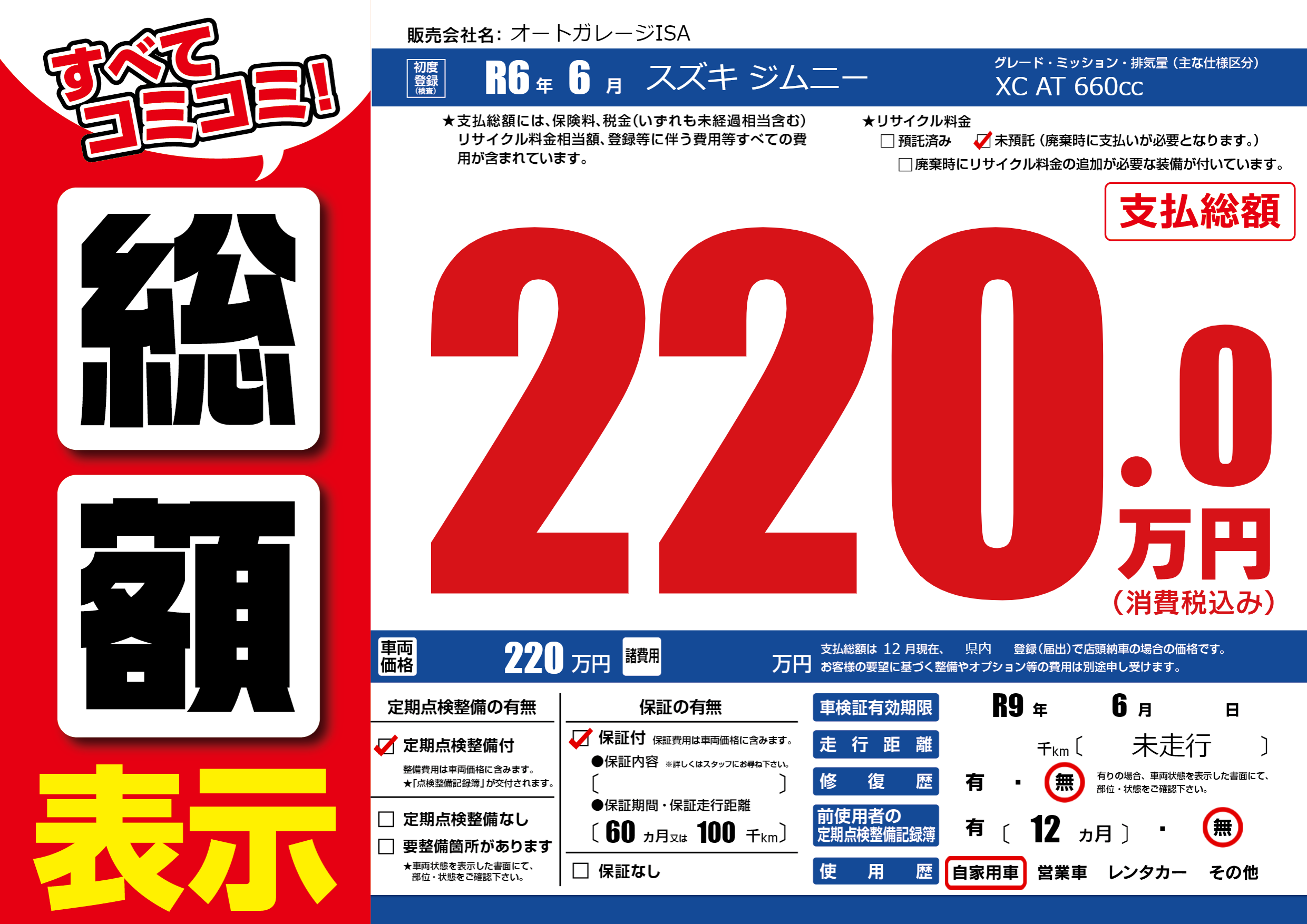 | 車名 | スズキ ジムニー | グレード ミッション 排気量 |