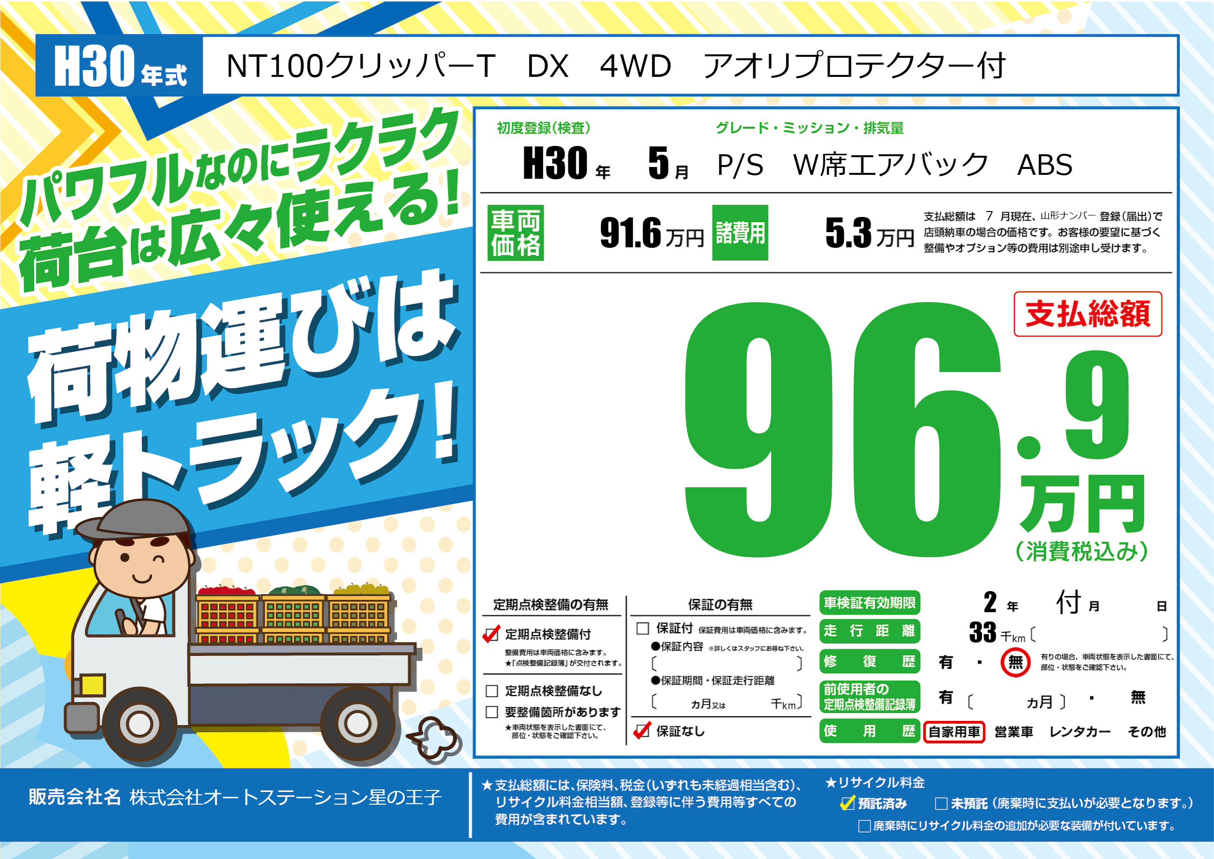 | 車名 | NT100クリッパーT DX 4WD アオリプロテクター付 | グレード ミッション 排気量 |
